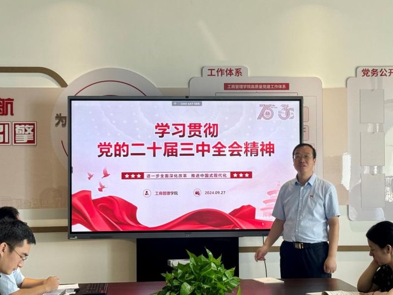 (通讯员范梦宇)9月27日下午,工商管理学院行政党支部在文瀚楼北703会议室开展主题党日活动。活动以“学习贯彻党的二十届三中全会精神,为进一步全面深化改革凝心聚力”为主题,结合支部书记讲授专题党课、党建业务融合专题、业务交流分享、集中理论学习等形式开展。本次活动由第一党小组承办,第一党小组组长江为民同志主持活动。