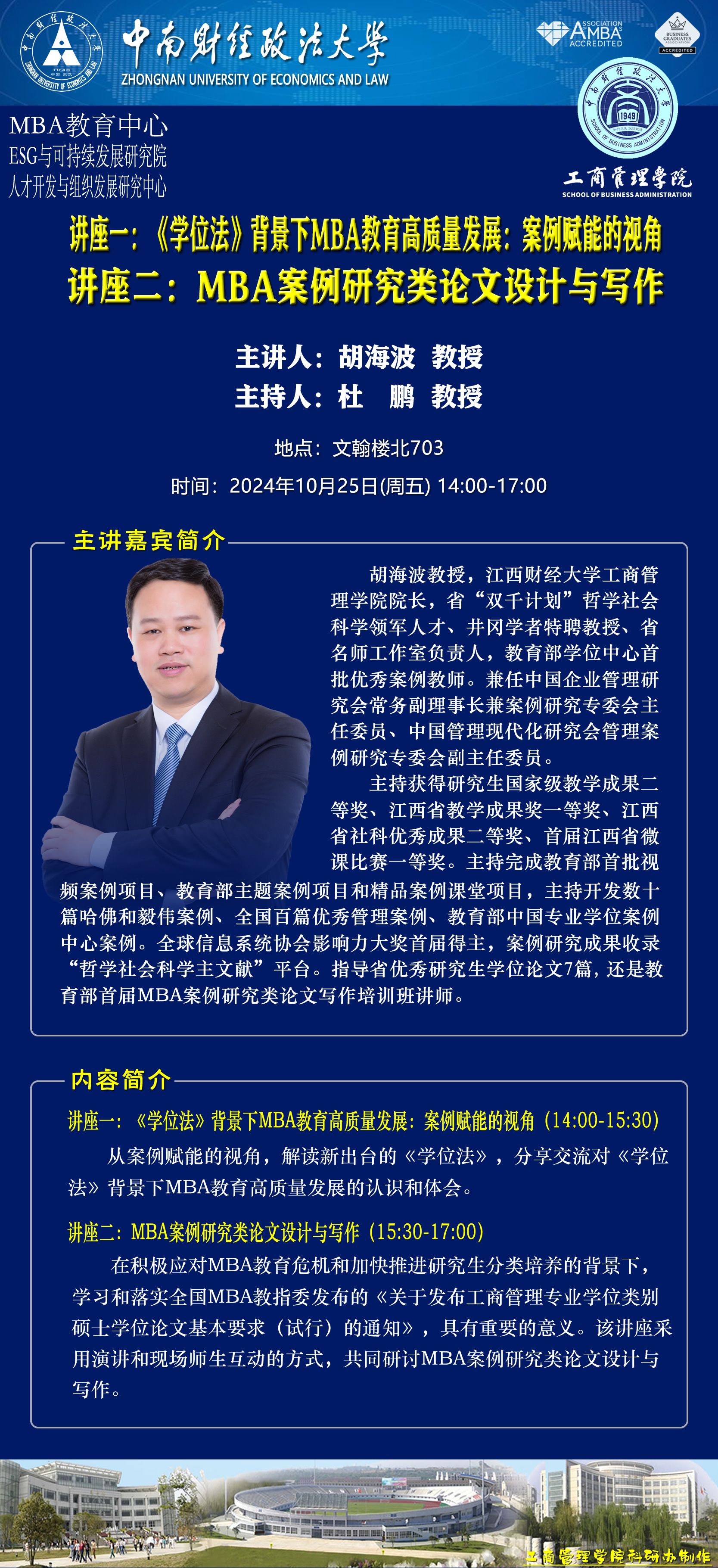 时间地点主办单位主持人主讲人主题2024.10.23 9:30-11:00文澴楼423经济贸易系刘凯 副教授程华 工程师东风新能源汽车“出海”的几点思考2024.10.24 18:30-20:00文泰楼113经贸名家论坛暨校友导航第23期吴英娜 副教授罗琦琳 财务副总裁管理沟通中的文化密码2024.10.25 14:00-17:00文翰楼北703MBA教育中心ESG与可持续发展研究院、人才开发与组织发展研究中心杜鹏 教授胡海波 教授讲座一:《学位法》背景下MBA教育高质量发展:案例赋能的视角讲座二:MBA案例研究类论文设计与写作