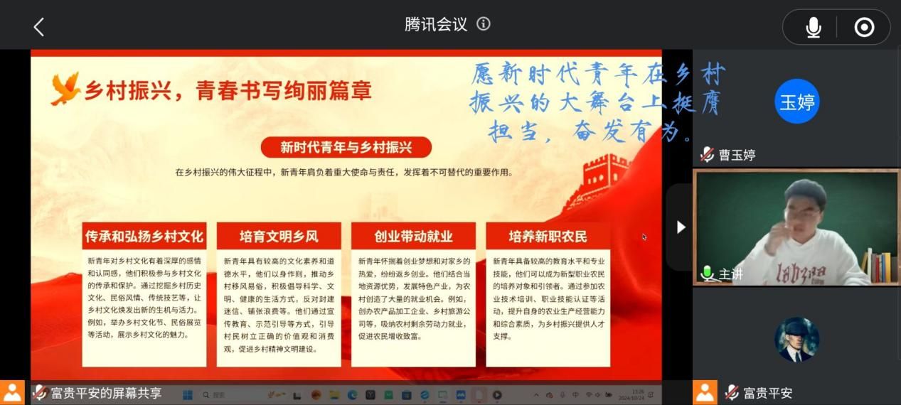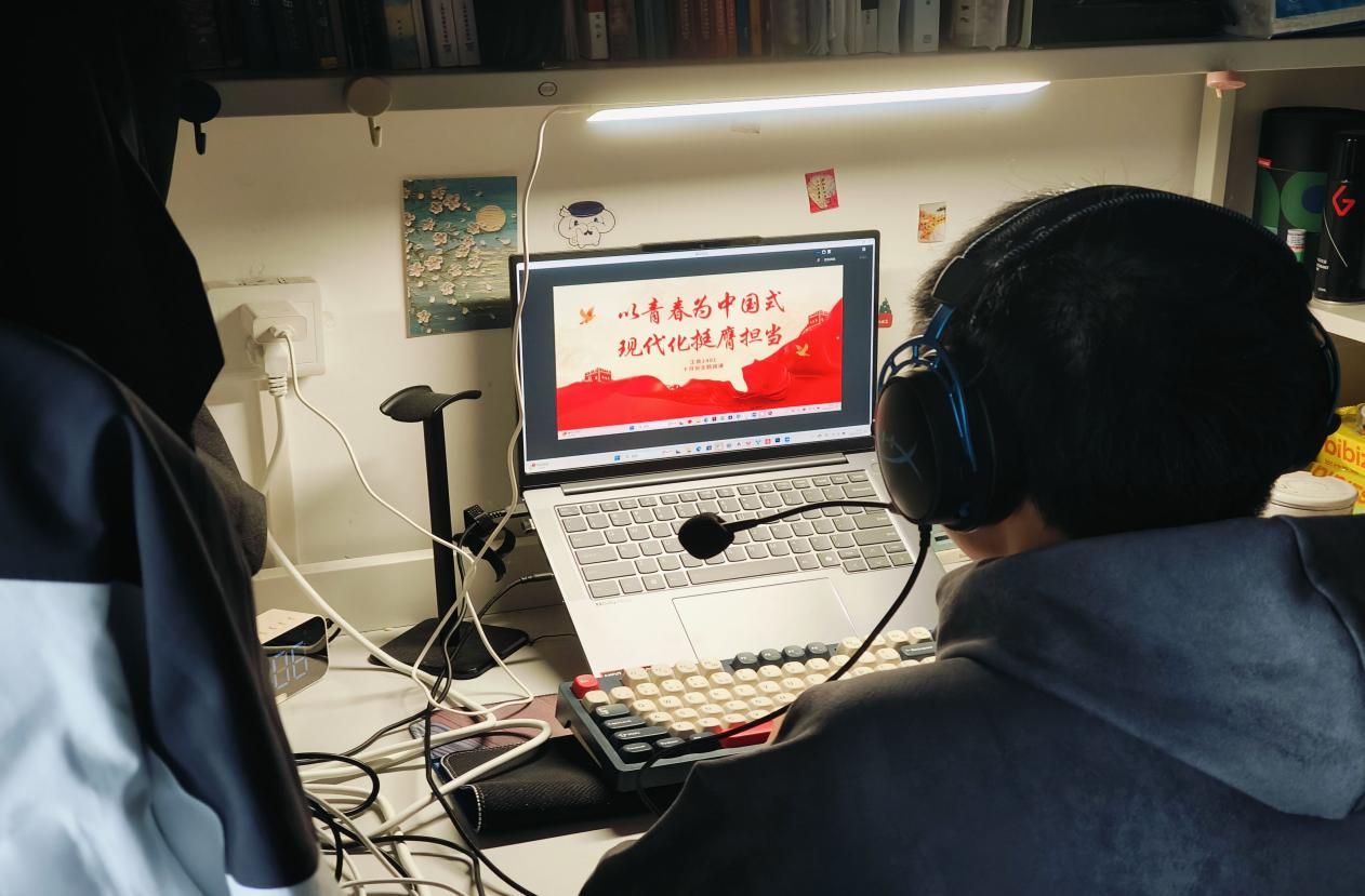 下午三点,同学们准时进入线上会议。在开场环节奏唱共青团团歌的洪亮歌声中,同学们起立共同歌唱,主题班会正式开始。
