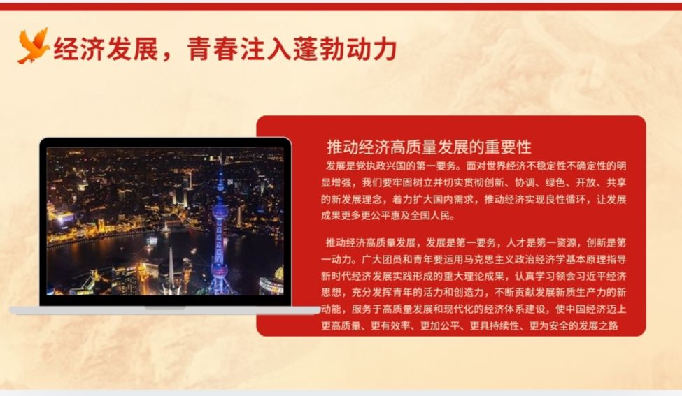 时间悄然流逝,不觉间来到了最后的“经济发展篇”章节,主持人向我们展示了近年来伟大祖国在经济领域的辉煌成就,不断增长的GDP总量,节节高升的贸易总额,无一不在昭示着祖国引进来与走出去政策的正确部署,无一不是祖国国力强盛,经济腾飞的光辉名片。同学们认真倾听着会议,为祖国的沧桑巨变而骄傲,对国家与日俱增的国力而自豪。