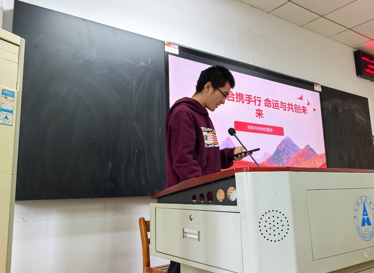 随后,学生代表崔宸雨以“志同道合携手行,命运与共创未来”为主题进行了理论宣讲。崔宸雨同学聚焦习近平外交思想一一构建人类命运共同体,从如何定义志同道合、文化与共荣、未来展望与挑战和青年做法四个章节进行了具体分享。