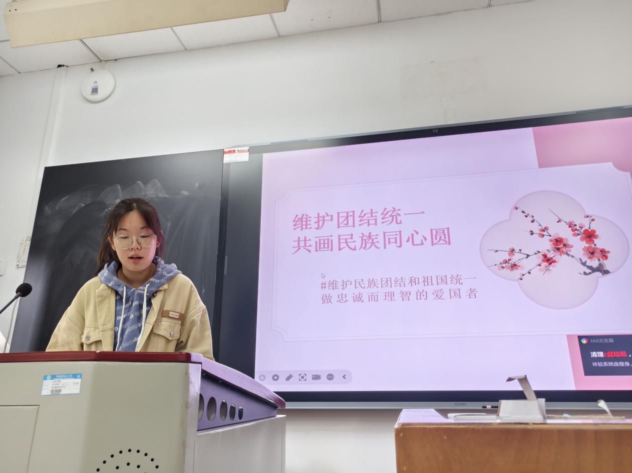 另外,学生代表李禾玉以“维护团结统一,共话民族同心圆”为主题进行了理论教育。李禾玉同学对通过对中国当下的民族政策的剖析,阐述了维护民族团结是社会安定、国家昌盛和民族进步繁荣的必要条件。更进一步,李禾玉同学通过对“一国两制”等国家制度和社会问题的分析,强调了祖国统一的必要性和重要性。最后,李禾玉同学强调,新时代青年要尊重各民族信仰、习惯等,要树立远大理想、提高自我素质,坚决同一切分裂祖国的势力作斗争,做祖国统一的维护者,做理性爱国的实践者。