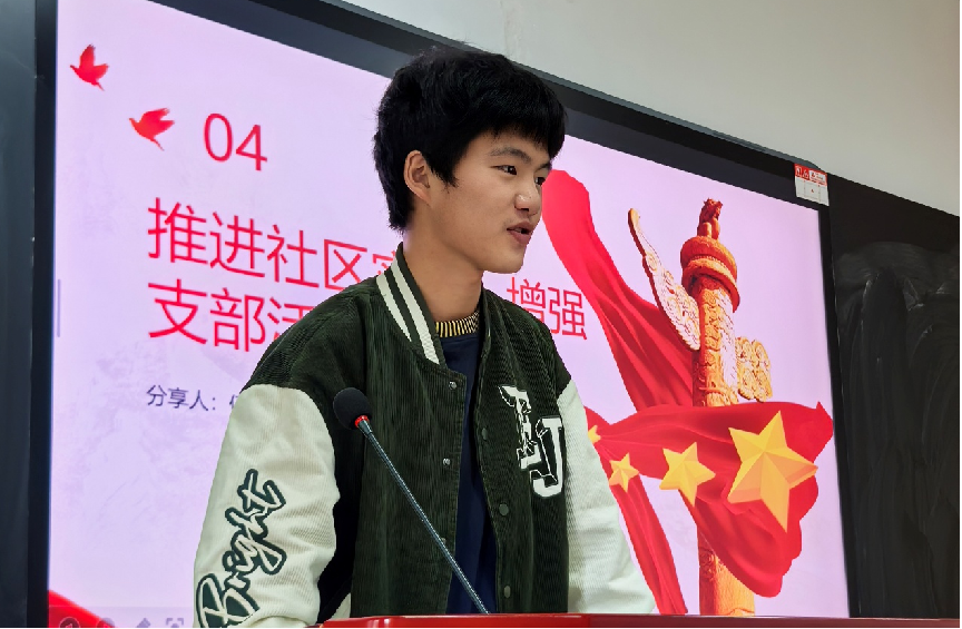 最后,学生代表伍相睿同学以“推进社区实践,增强支部活力”为主题,向同学们讲述了自己的志愿经历,传递志愿精神,以实际行动关爱社区老年儿童,呼吁同学们积极参与关爱老年儿童的公益活动。