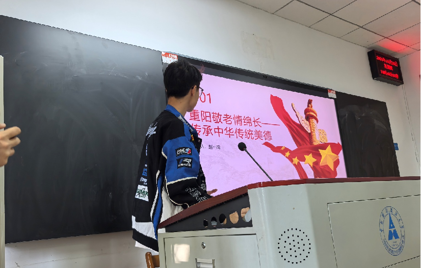 此外,在志愿经历分享环节,学生代表赵一鸣以“重阳敬老情绵长-传承中华传统美德”为题向同学们分享了自己在今年重阳节开展的志愿实践,他呼吁同学们更多地加入助老活动中,为构建幸福社会贡献力量。