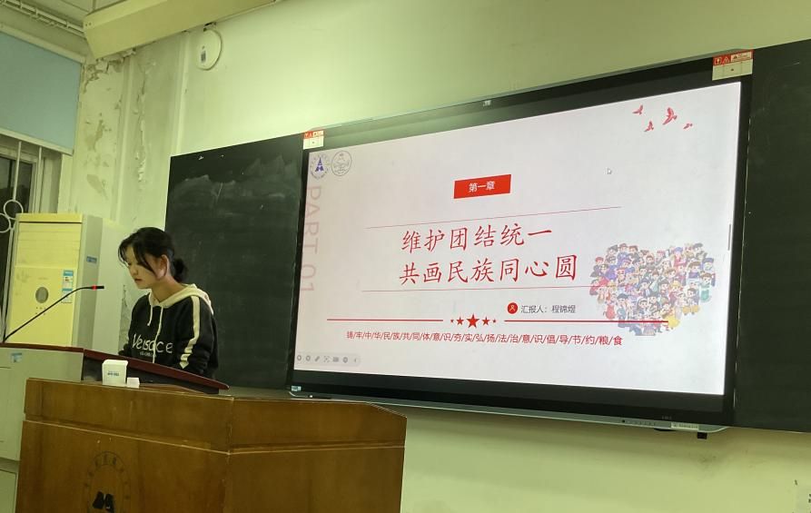 第二个环节,由程锦煜同学带领开展理论学习部分。“维护团结统一,共画民族同心圆”和“志同道合携手行,命运与共创未来”增强民族认同感,强调各国间相互依存,共同应对全球性挑战。
