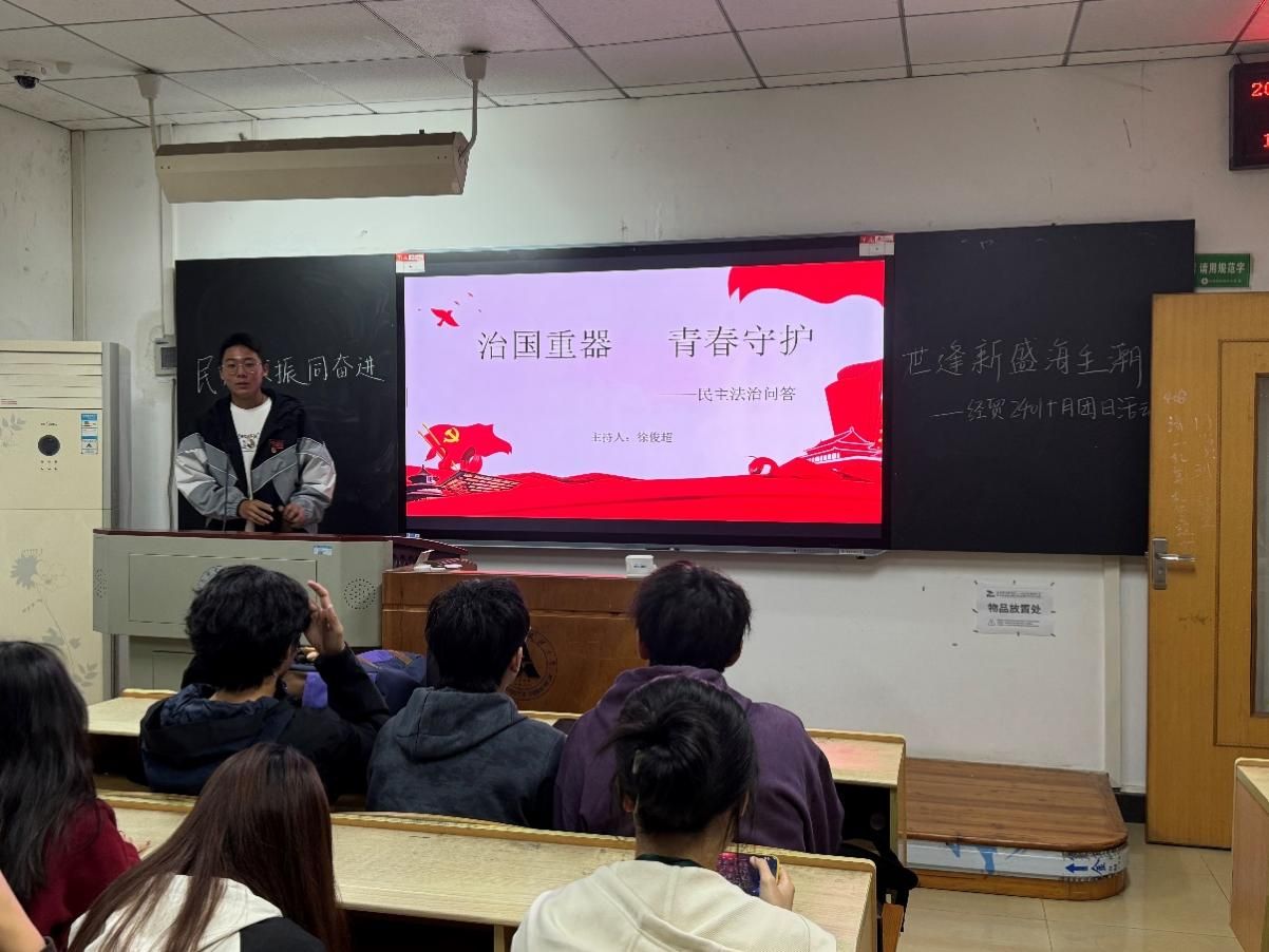 “法者,天下之程式,万世之仪表。”“民主制度,天下之公理。”国之重器,当以青春守之,徐俊超同学开展法律相关知识点问答环节,普及法律知识,提升民主意识。