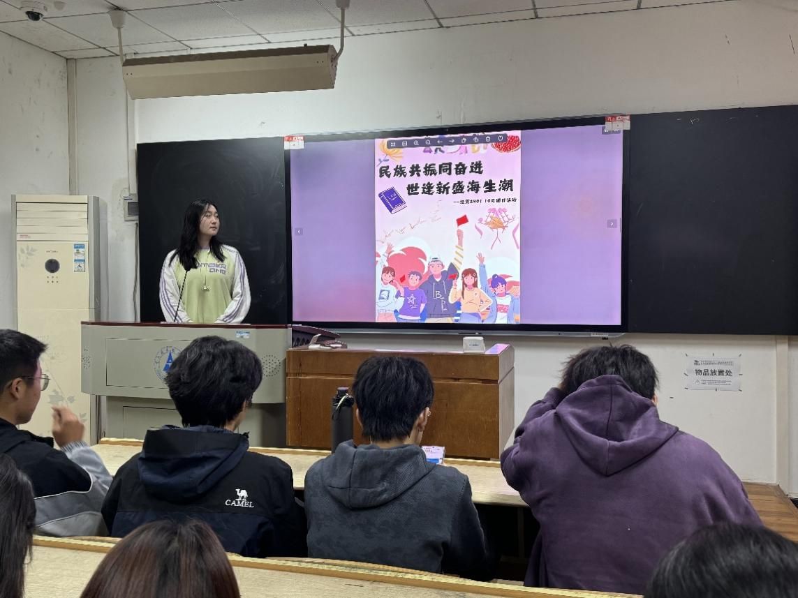 (通讯员 张艺丹 摄影 张芷睿)风禾尽起,山止川行,金色十月,新的学期重新开始,新的征程坚守信仰。为了进一步宣传习近平新时代中国特色社会主义思想,坚定共产主义信念,培养德智体美劳全面发展的新时代青年,工商管理学院经济与贸易类2401班在10月21日于文泽楼304开展以“民族共振同奋进,世逢新盛海升潮”为主题的团日活动班会。