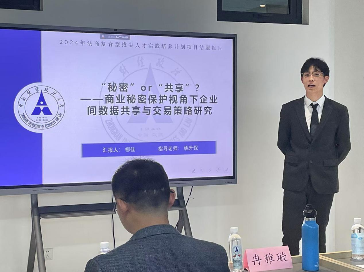 最后答辩的是法商项目《“秘密”or“共享”?—商业秘密保护视角下企业间数据共享与交易策略研究》,项目负责人刘馨忆同学作结题报告。