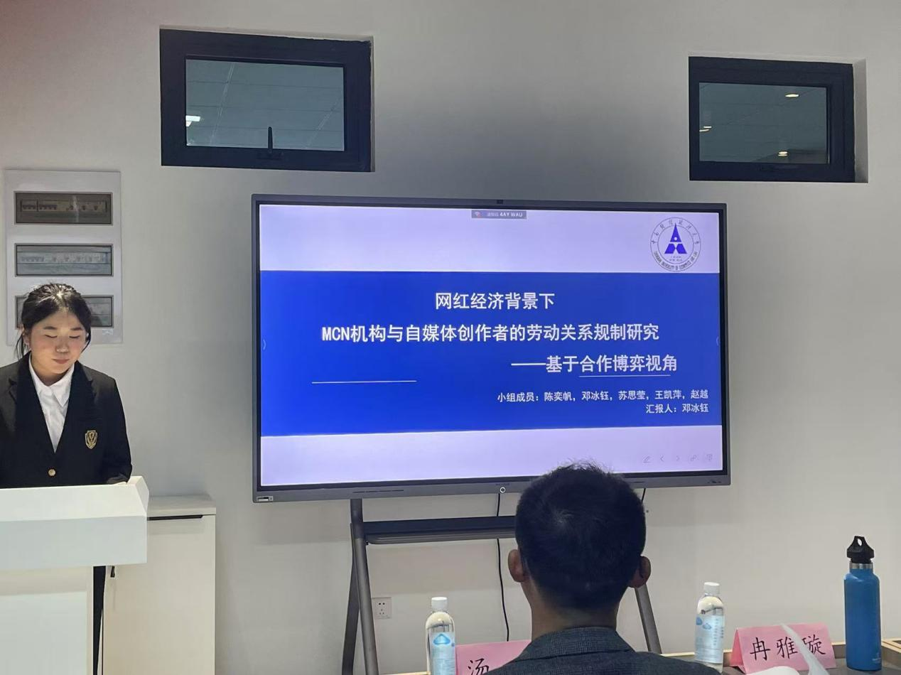 接着是答辩的是法商项目《网红经济背景下MCN机构与自媒体创作者的劳动关系规制研究—基于合作博弈的视角》,项目答辩代表邓冰钰同学作结题报告。