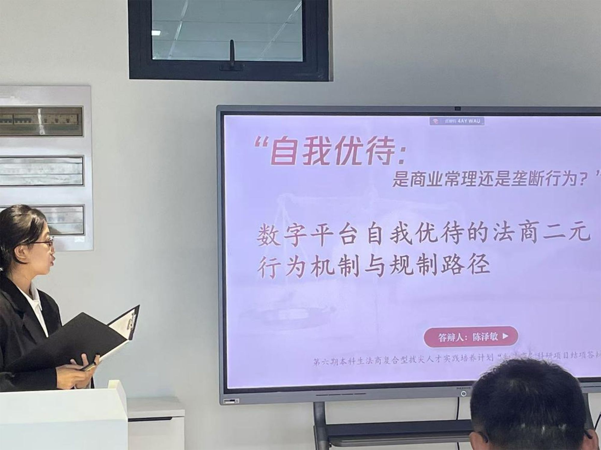 接下来是答辩的是法商项目《商业伦理还是垄断行为?平台自我优待的行为机制与法商二元规制路径》,项目答辩代表陈泽敏同学作结题报告。