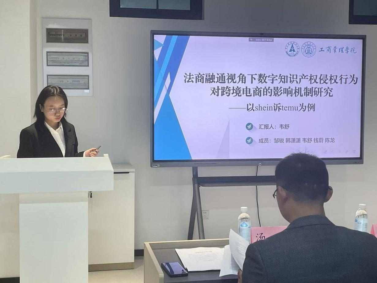 接着答辩的是法商项目《法商融通视角下跨境电商数字产权侵权行为构成机制与监管对策研究—以shein诉temu为例》,项目负责人邹锐同学做结题报告。