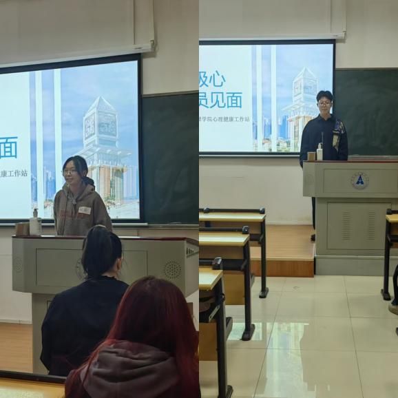 紧接着蔡佳欣同学向大家介绍了心理工作站的主要心理活动与工作职责,并着重分享了以心理主题班会、朋辈心理互助游戏等特色活动为主体的心理健康教育活动节的重要意义。“五二五”心理文化节在每年的四五月份召开,由心理工作站组织策划,是本校最大规模的品牌心理健康教育活动,也是学院心理健康工作的集中体现。