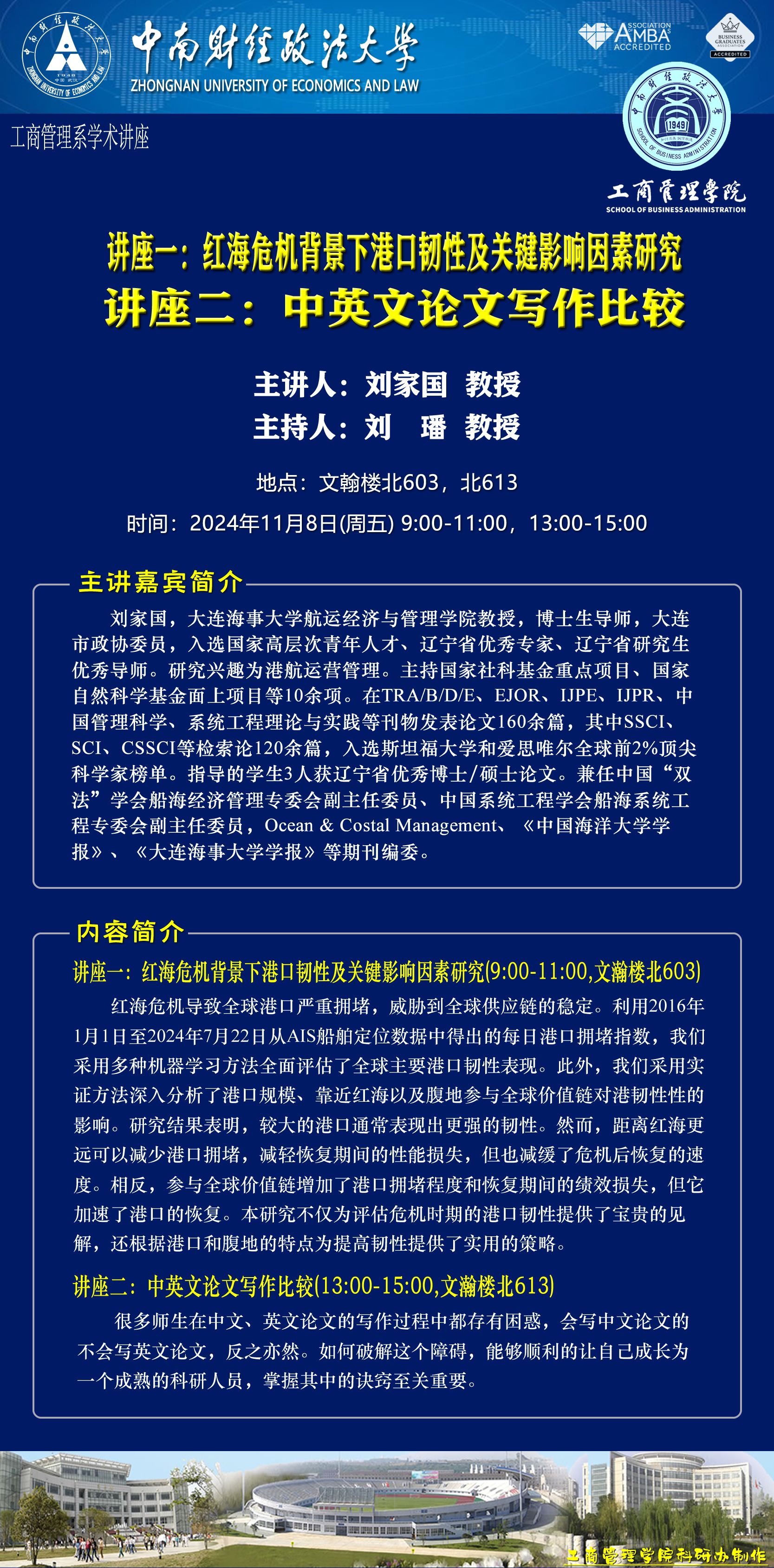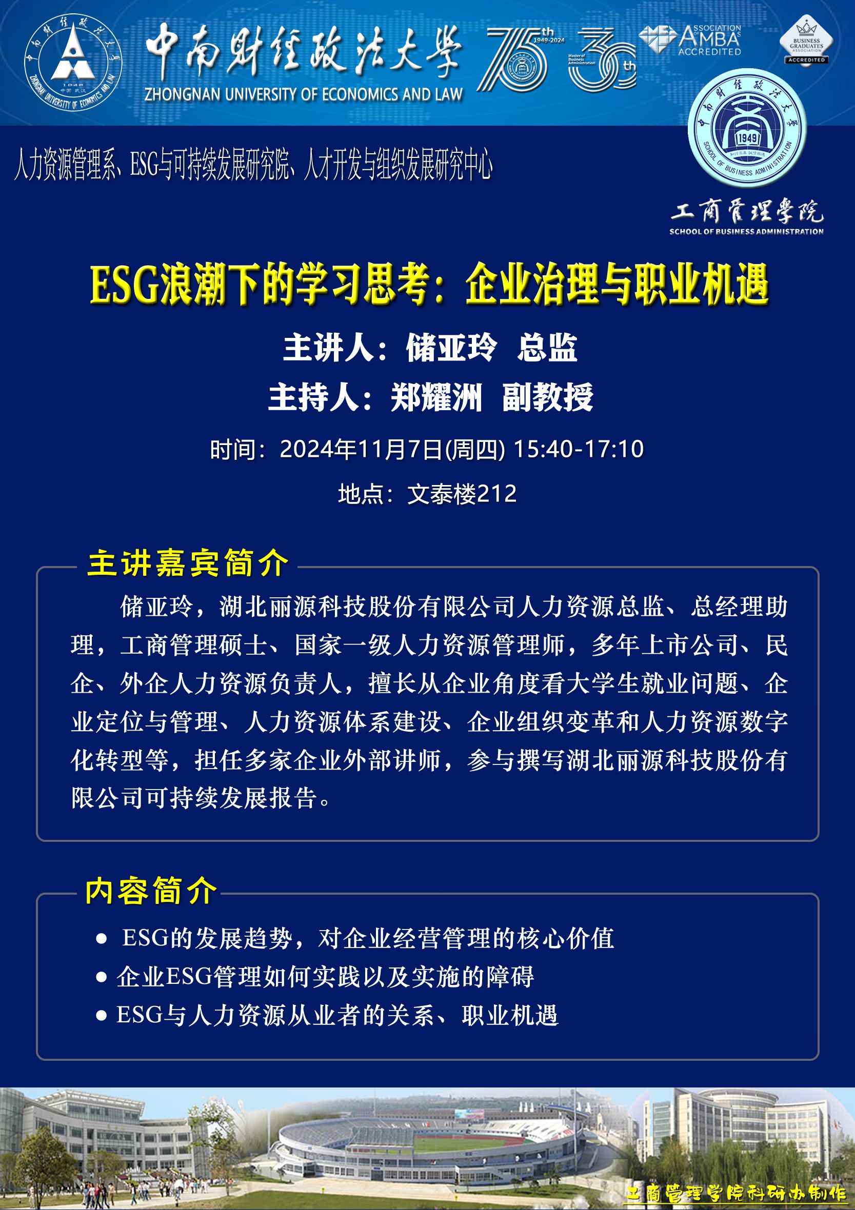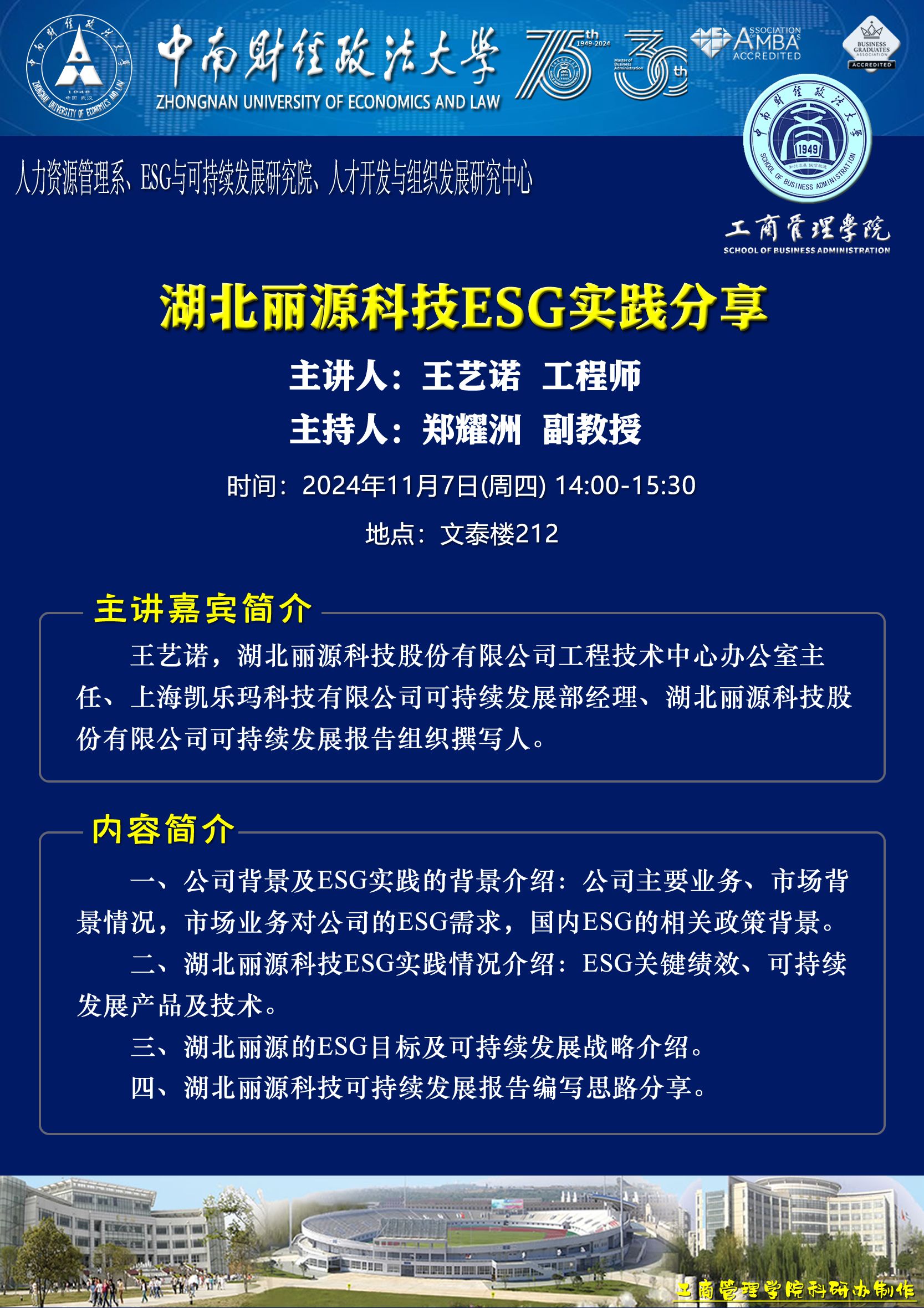 时间地点主办单位主持人主讲人主题2024.11.05 10:00-11:30文瀚楼东601营销管理系费显政 教授王承璐 教授通过讲故事展示贡献:如何降低论文被桌面拒绝的可能性2024.11.07 14:00-15:30文泰楼212人力资源管理系、ESG与可持续发展研究院、人才开发与组织发展研究中心郑耀洲 副教授王艺诺 工程师湖北丽源科技ESG实践分享2024.11.07 15:40-17:10储亚玲 总监ESG浪潮下的学习思考:企业治理与职业机遇2024.11.089:00-11:00, 13:00-15:00文瀚楼北603文瀚楼北613工商管理系刘璠 教授刘家国 教授讲座一:红海危机背景下港口韧性及关键影响因素研究讲座二:中英文论文写作比较