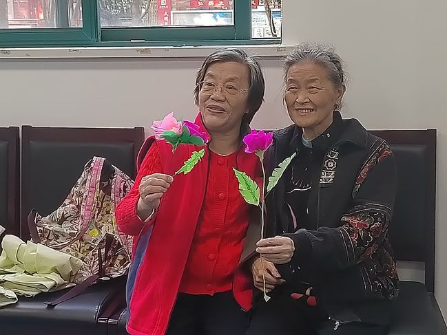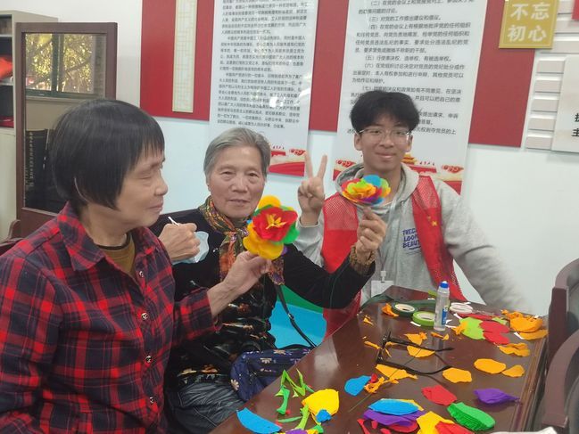 纸柔意美,褶妙形佳。在志愿者们的帮助下,老人们也都渐渐上手,全神贯注地投入到制作当中。那一双双饱经风霜的手,此刻小心翼翼地摆弄着纸张和工具,仿佛找回了年轻时的灵巧。不一会儿,一朵朵色彩斑斓的褶皱纸花朵便在手中徐徐绽放开来,整个活动中心都萦绕在浓浓的温馨与喜悦之中。老人们不但专注于自己动手制作,还格外贴心地帮助他人完善作品。大家彼此交流心得,互相协助,脸上洋溢着自豪与满足,映照得褶皱纸花朵愈发娇艳欲滴。活动尾声之时,一位老奶奶满心欢喜地拉着志愿者拍照留念,嘴里还念叨着:“谢谢你啊,同学,瞧,你教我做的这花多好看!”