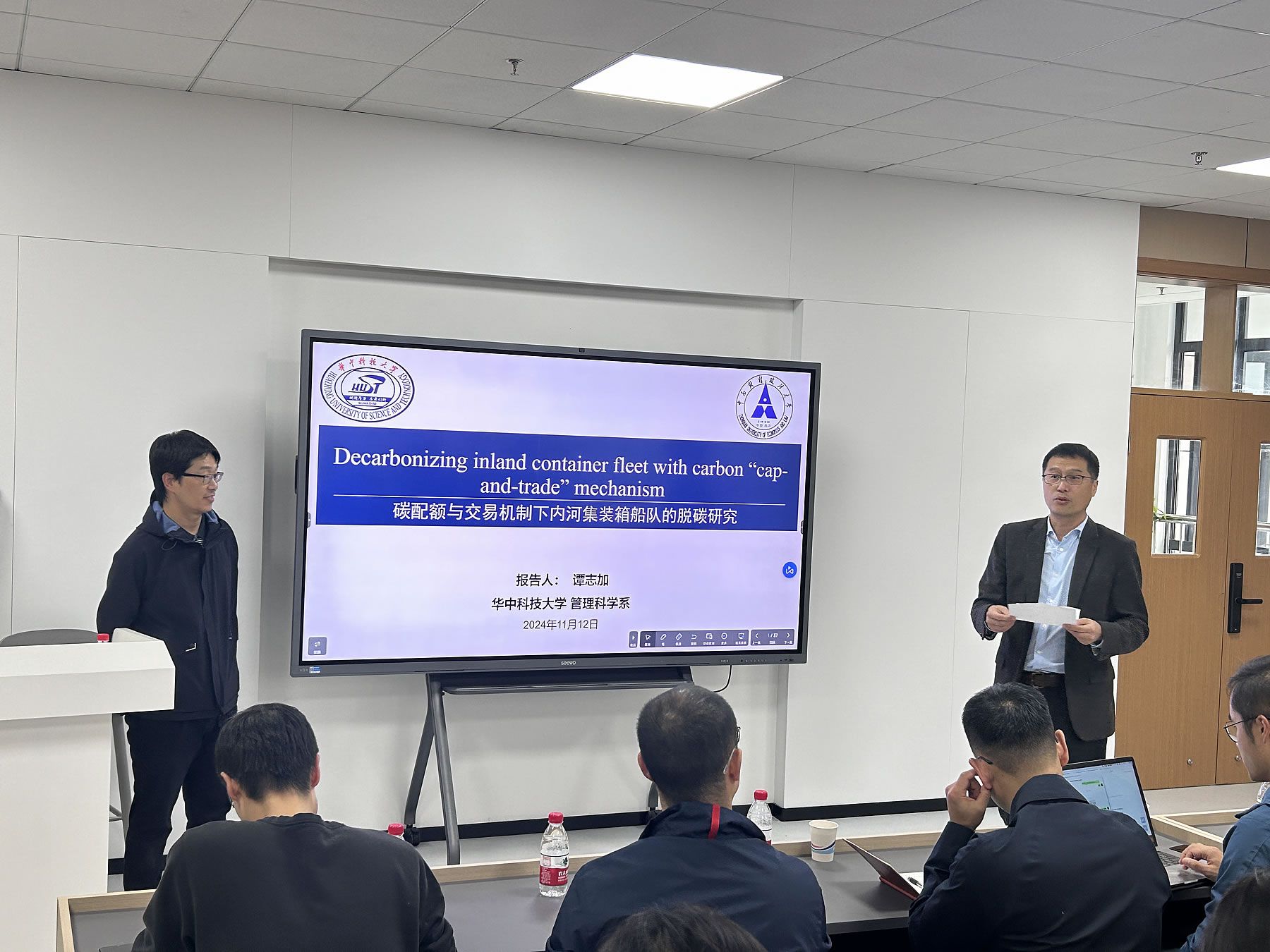 讲座第二项,谭老师分享了其最新研究成果:关于碳配额与交易机制下内河集装箱船队的脱碳研究,详细介绍了在当前全球气候变化和环境压力下,内河集装箱船队面临的脱碳挑战和机遇。谭老师深入分析了碳配额与交易机制对船队运营的影响,探讨了不同减排策略的经济效益和环境效益。此外,谭老师还讨论了政策制定者如何通过碳市场机制激励船队采取减排措施,以及船队管理者如何响应这些政策,实现经济效益与环境责任的双重目标。研究不仅为航运公司在新的环境政策下制定战略提供了科学依据,也为政策制定者提供了如何通过市场机制促进航运业减排的有效见解。
