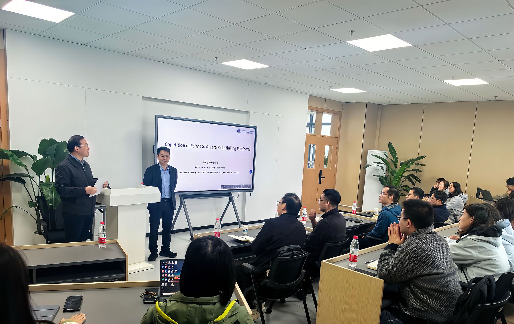 钟教授指出网约车竞合平台兴起后,大型网约车平台面临新选择,其决策影响自身及小型网约车平台、竞合平台和消费者剩余。钟教授深入分析各方在这一竞争场景下的状况,进而提出公平感知定价机制。此研究为网约车平台运营策略提供参考,也为监管者规范市场提供新思路,让各方重新认识到公平定价在行业发展中的重要性,同时为政策制定者提供了从市场机制层面优化网约车行业竞争格局的有效见解。之后,参会老师与同学们围绕钟教授分享的研究成果进行了深入的交流讨论。我院师生就网约车平台订单分配算法、定价公平约束实现方法、竞合平台针对大平台价格歧视可实施策略等问题与钟远光教授展开了深入研讨,钟远光教授耐心聆听并分享了自己的见解和想法。