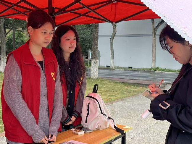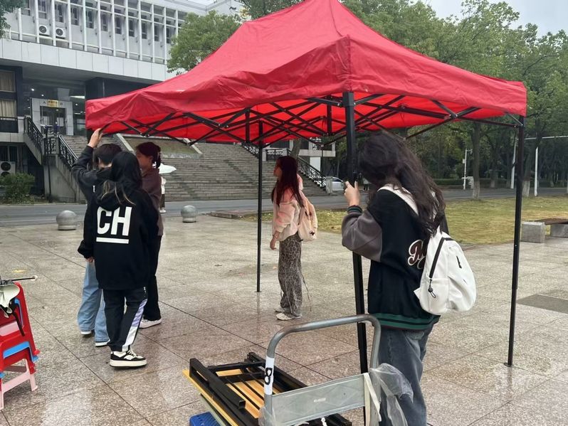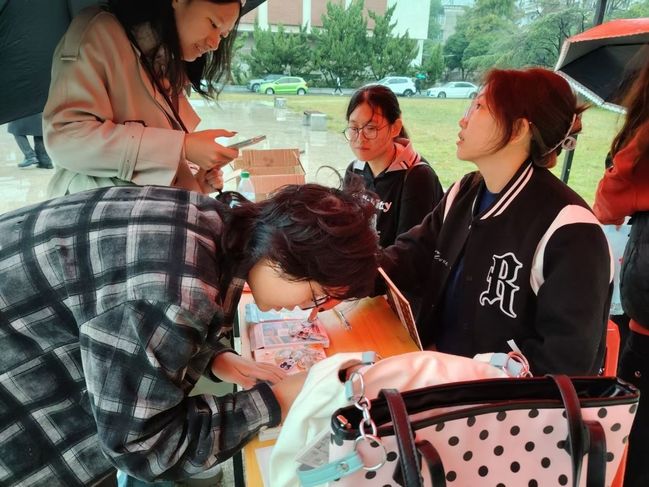 雨丝织心网,书泽育幼苗。骤降的气温并未阻挡中南大学子的爱心奉献,雨幕中,志愿者们不断地向来往的师生介绍活动,并将他们牵引至那善意汇聚的方向——坚挺的帐篷内。志愿者们真诚生动的描述打动了同学们热忱的心,一时间,虽则风雨不止,而暖意融融,前来捐书的身影络绎不绝。一名男生在了解活动后,便询问活动何时结束,并表示自己一定会带上心爱的书籍前来捐赠,不久,这个熟悉的身影再一次出现在志愿者们面前,他大步跑来,一边甩甩身上的雨水,一边庆幸地长舒一口气。再一瞧,他护在怀里的是被保护完好的、仍带着体温的书本。寒风呼啸间,又一位同学背着沉甸甸的书包冒雨赶来。从书包里拿出精心挑选的书籍,他笑着说道:“希望我的这些书能在其他地方发挥出更大的作用。”一本本承载着知识与希望的书籍,汇聚成了一片知识的海洋。它们带着捐赠者的衷心祝愿,即将踏上前往涂镇的旅程。