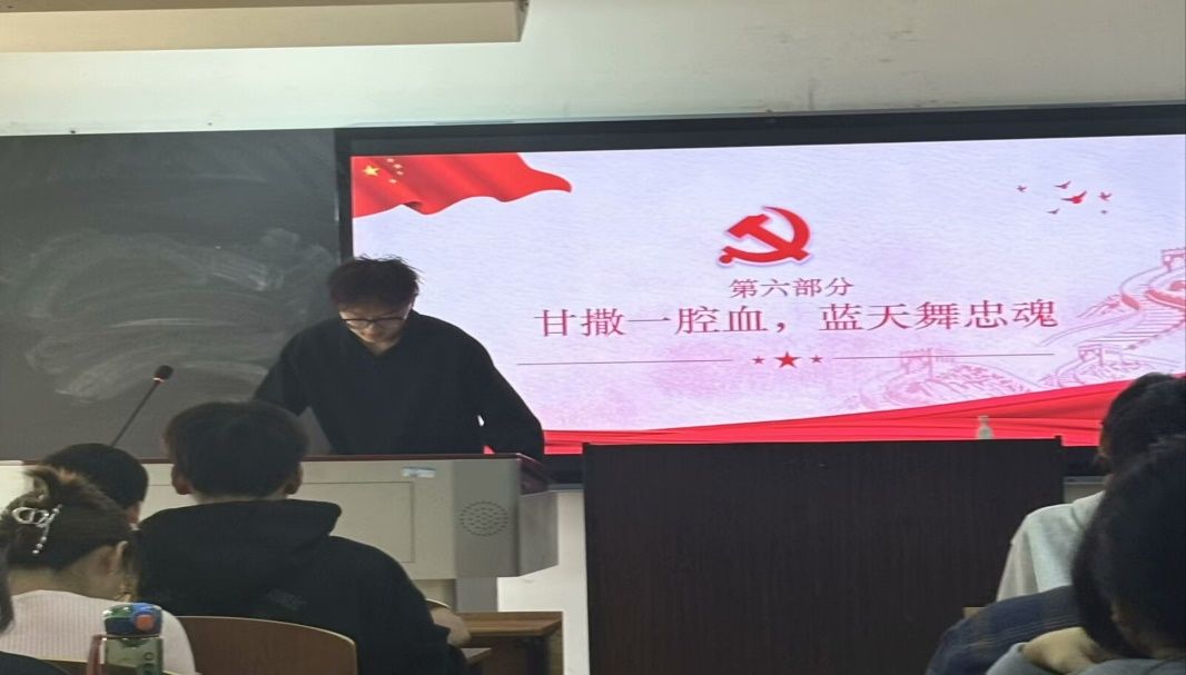 活动第六项,“甘洒一腔血,蓝天舞忠魂”。在人民空军成立75年之际,班长韦烨同学带领同学们学习空军精神,致敬蓝天卫士。韦烨同学先从人民空军的基本知识开始科普,随后指出学习空军精神的重要意义,在这一过程中,播放了人民空军成立七十五周年宣传片《为你》,向同学们展现了中国空军七十五年来的成长与巨大变化。“飞机飞两遍”的时光已是过去,如今的人民空军已然成向长空利剑,我们始终向人民空军致敬。