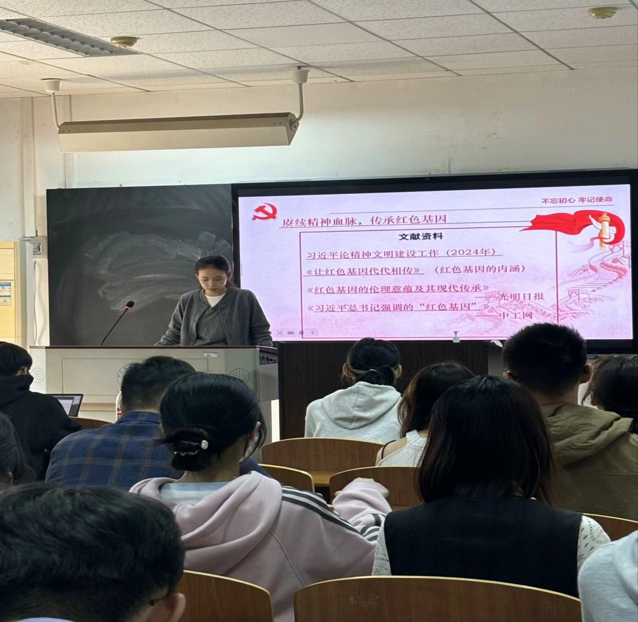 活动第二项,“赓续精神,传承红色基因”。团支书高若茗同学带领大家阅读党的文献资料,理解红色基因的内涵,感悟代代相传的精神血脉的力量。主持人在活动现场开展知识竞答环节,同学们踊跃回答,在互动中增加对红色基因的深刻了解。