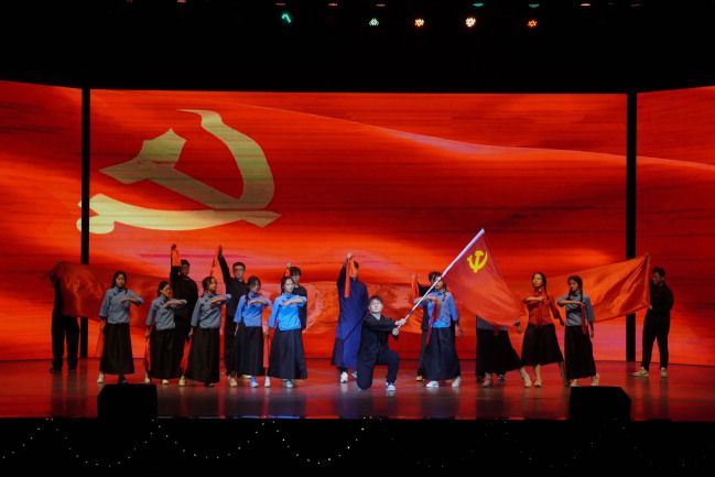 河山依旧战旗红,热血儿女壮志酬。经贸2403班携着作品《一抹红》站上舞台。他们在舞台上奋力起舞,灵动的舞姿如娇艳欲滴的花朵,又如熊熊燃烧的烈火,展现出工商青年的风发意气,歌颂着生生不息的红色精神。