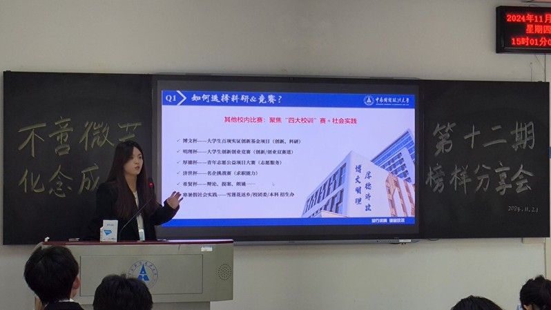 (通讯员 杜佳宜)为充分发挥榜样的引领作用,帮助同学们更好地了解保研政策,获取科研竞赛相关知识,激励同学奋发图强,工商管理学院第十二期“不啻微芒 化念成行”系列主题的榜样分享会于2024年11月21日下午在文润112教室顺利召开。本次分享会由“榜样工商”中南商科好青年获得者——赵晨彤担任主讲人,工商管理学院24级学生参与。