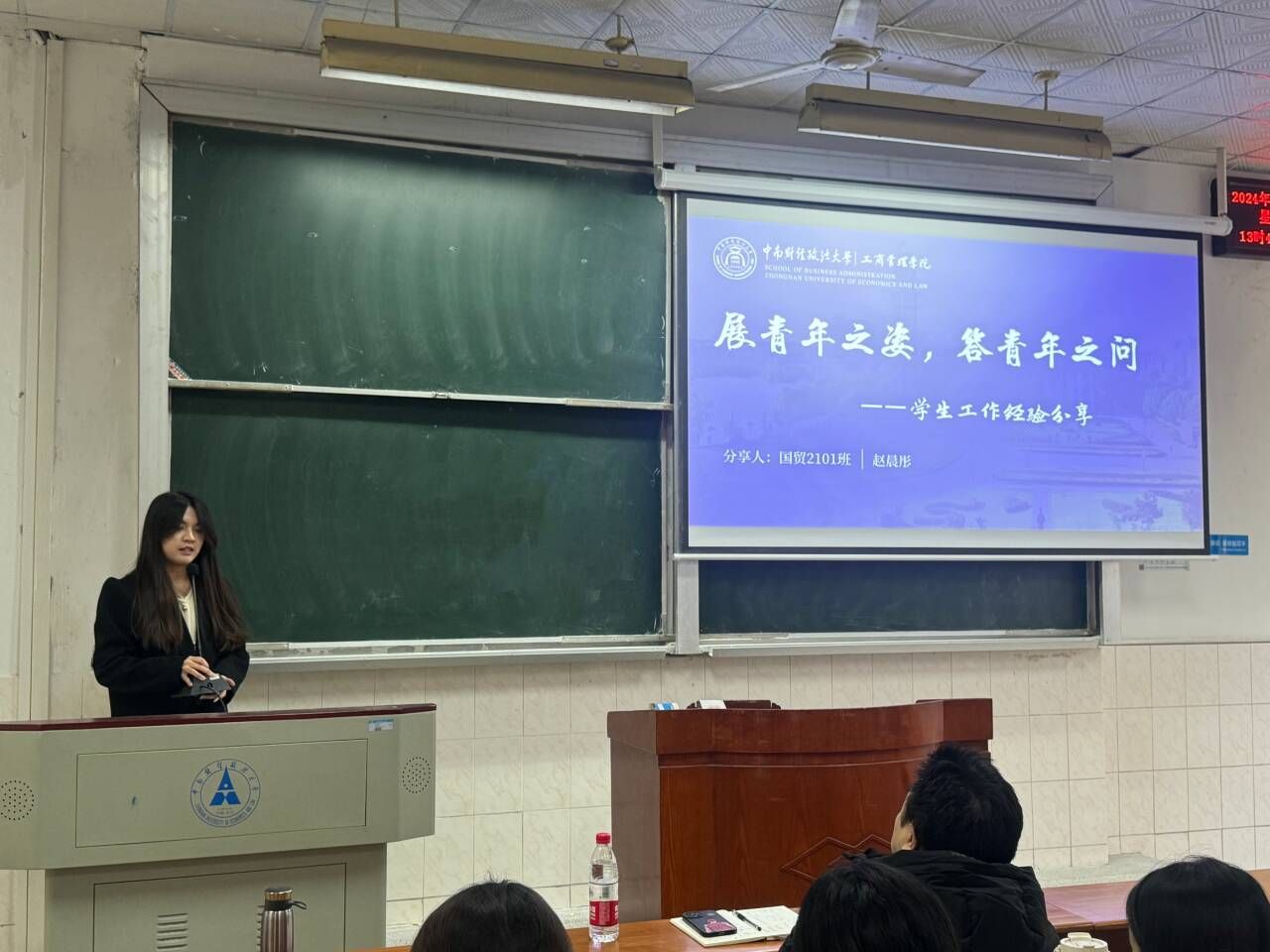 随后,赵晨彤以“展青年之姿,答青年之问”为主题,分享自己担任学生干部的心路历程。她表示,在学生干部工作的广阔舞台上,大家应牢固树立服务者意识,秉持勤勉敬业、求真务实的工作作风,耐心倾听同学心声诉求,在评优评先与奖学金评定等关键环节更要公平公正、严谨细致。她还强调,学生干部应当心怀责任感,以果敢行动破解难题,以无私奉献精神为班级、学院发展添砖加瓦。