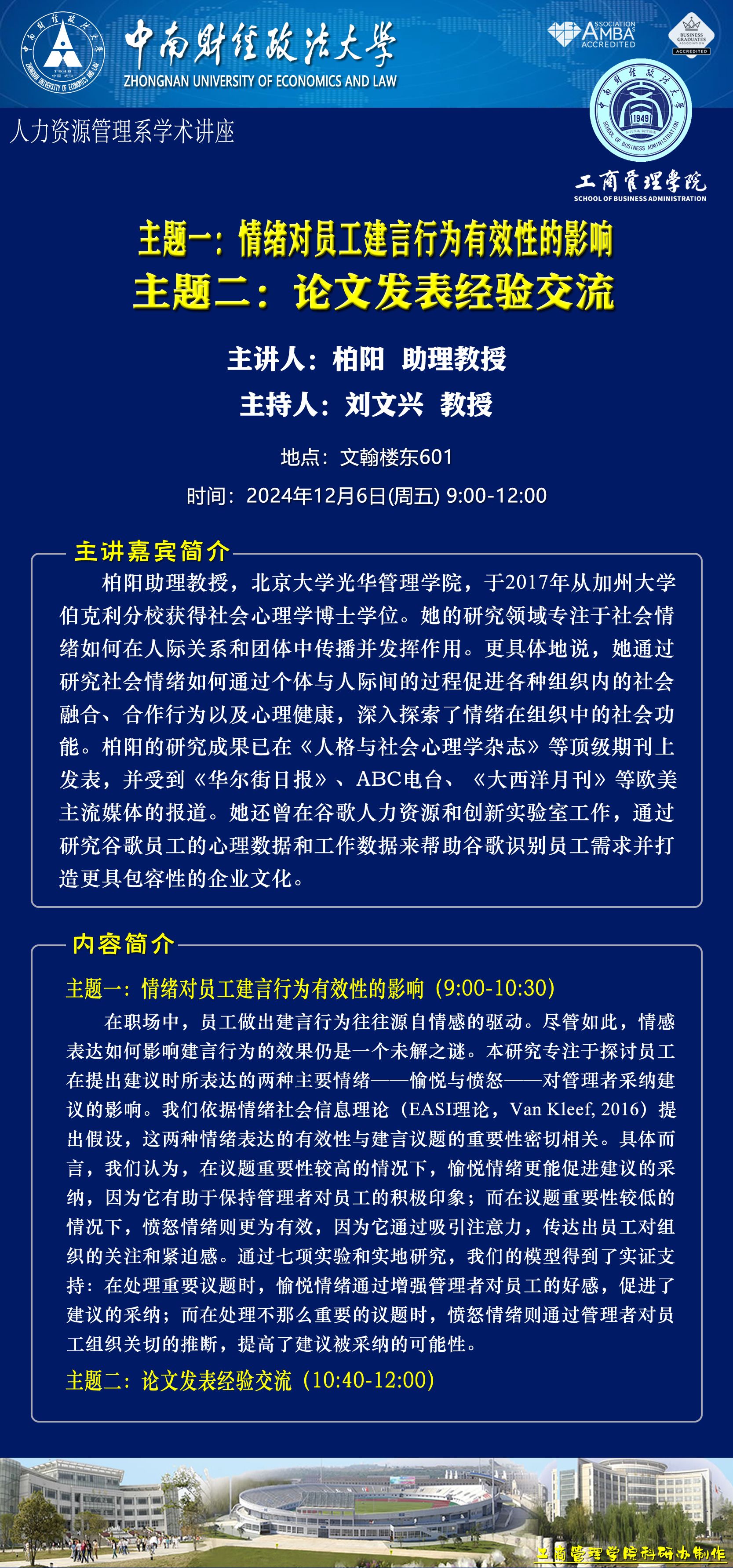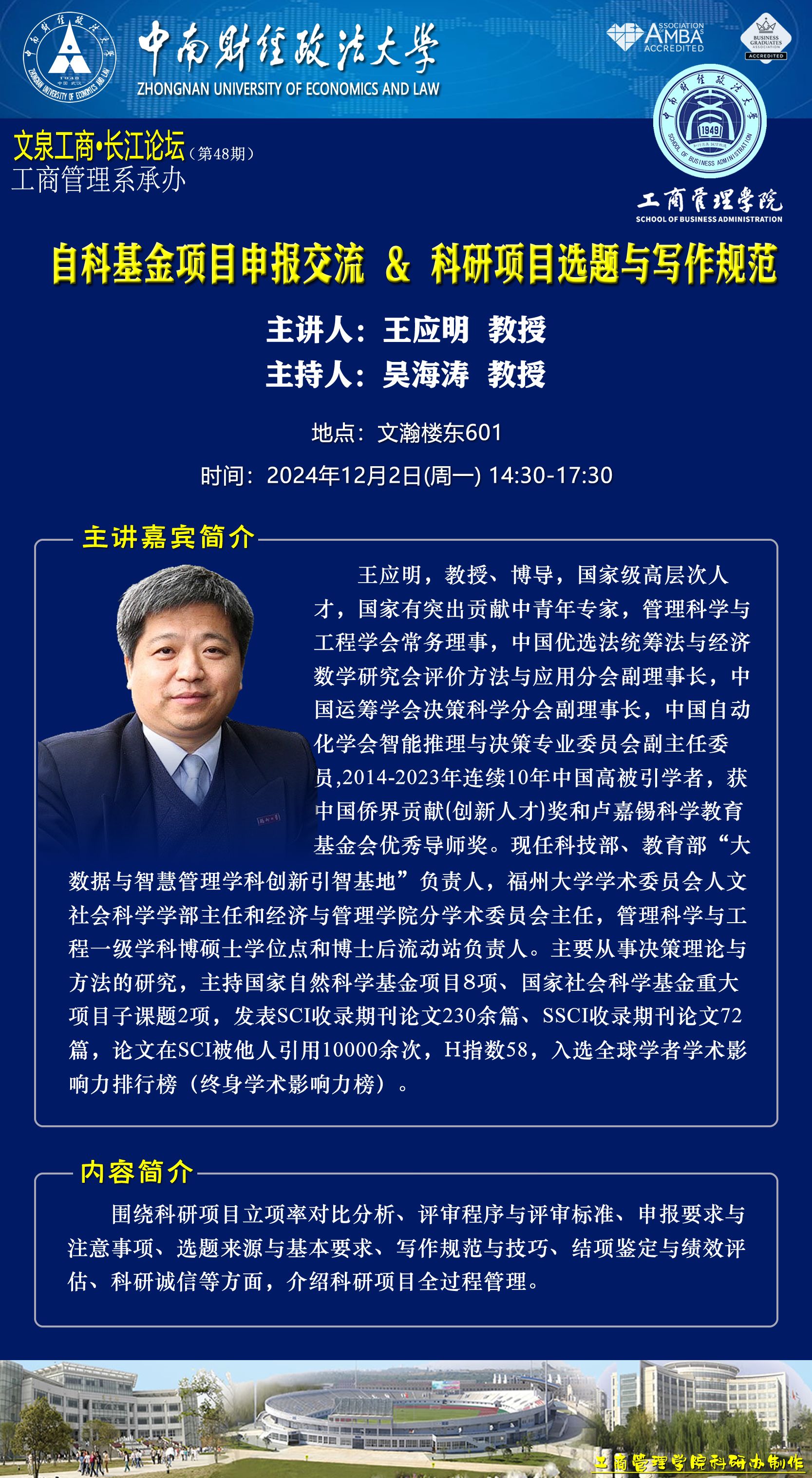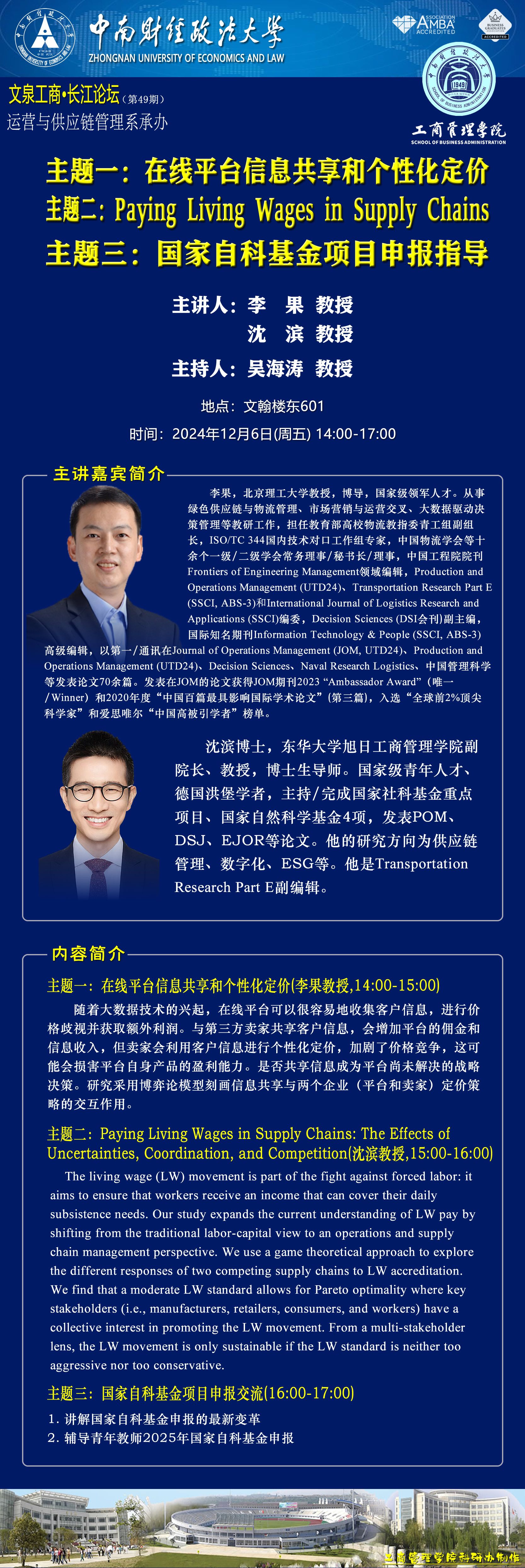 时间地点主办单位主持人主讲人主题2024.12.02 14:30-17:30文瀚楼东601文泉工商•长江论坛(第48期)工商管理系承办吴海涛 教授王应明 教授自科基金申报交流 & 科研项目选题与写作规范2024.12.069:00-12:00文瀚楼东601人力资源管理系刘文兴 教授柏阳 助理教授主题一:情绪对员工建言行为有效性的影响主题二:论文发表经验交流2024.12.0614:00-17:00文瀚楼东601文泉工商•长江论坛(第49期)运营与供应链管理系承办吴海涛 教授李果 教授沈滨 教授1.在线平台信息共享和个性化定价(李果教授)2.Paying Living Wages in Supply Chains: The Effects of Uncertainties, Coordination, and Competition(沈滨教授)3.国家自科基金项目申报指导