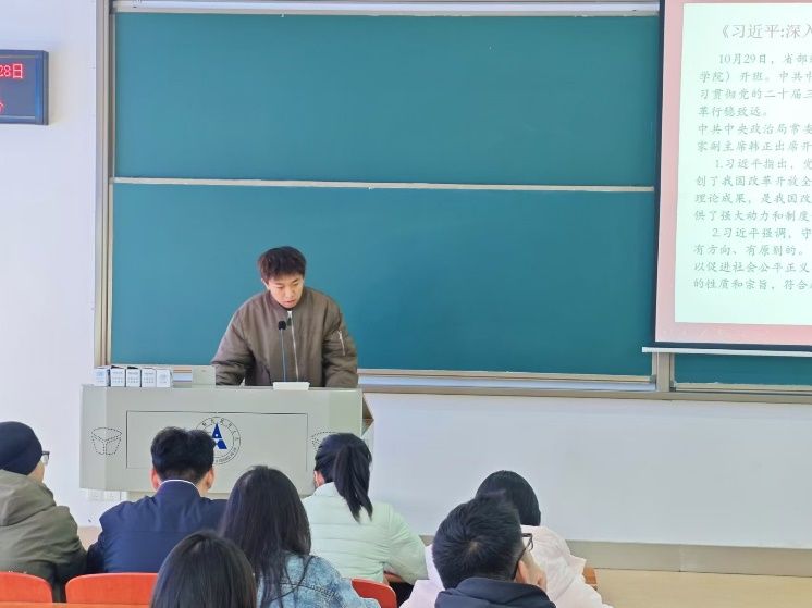 随后,杜欣哲同学分享了《习近平:深入学习贯彻党的二十届三中全会精神 凝心聚力推动改革行稳致远》的学习心得。他详细解读了习近平总书记关于全面深化改革的重要讲话精神,指出守正创新是进一步深化改革开放必须牢牢把握的重大原则,并强调了引导全党全国人民坚定改革信心,更好凝心聚力推动改革行稳致远。