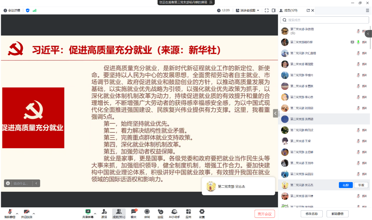 之后,杨丹柳同志带领学习了《促进高质量充分就业》,通过学习全体同志意识到我国为促进高质量充分就业,始终坚持以人民为中心的发展思想,全面贯彻劳动者自主就业、市场调节就业、政府促进就业和鼓励创业的方针。作为大学生群体,就业与青年学子息息相关,全体同志深刻认识到在以后的学习生活中要努力提升自我,其内化于心,外化于行,在学深悟透的基础上,从自身做起,要落实在行动上,做到学以致用,知行合一。