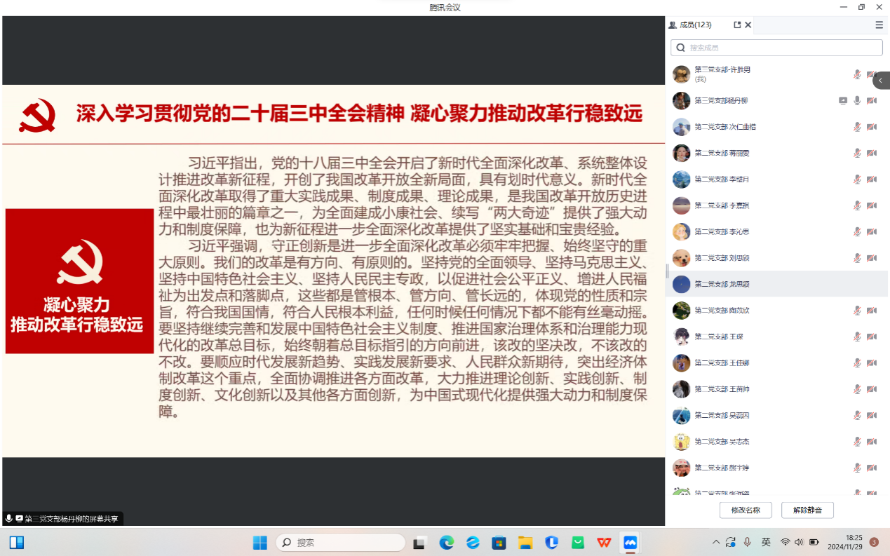 随后,李佳音同志带领学习《贯彻党的二十届三中全会精神,凝心聚力推动改革行稳致远》,习近平总书记指出:“党的二十届三中全会开启了新时代全面深化改革,系统整体设计推动改革新进程,开创了我国改革开放全新局面,具有划时代意义。新时代全面深化改革取得了重大实践成果、制度成果、理论成果,是我国改革开放历史进程中最壮丽的篇章之一。”通过深入学习,全体同志深刻理解了守正创新是进一步全面深化改革必须牢牢把握、始终坚守的重大原则,同时也用热烈的掌声表明了对所学内容的赞同。