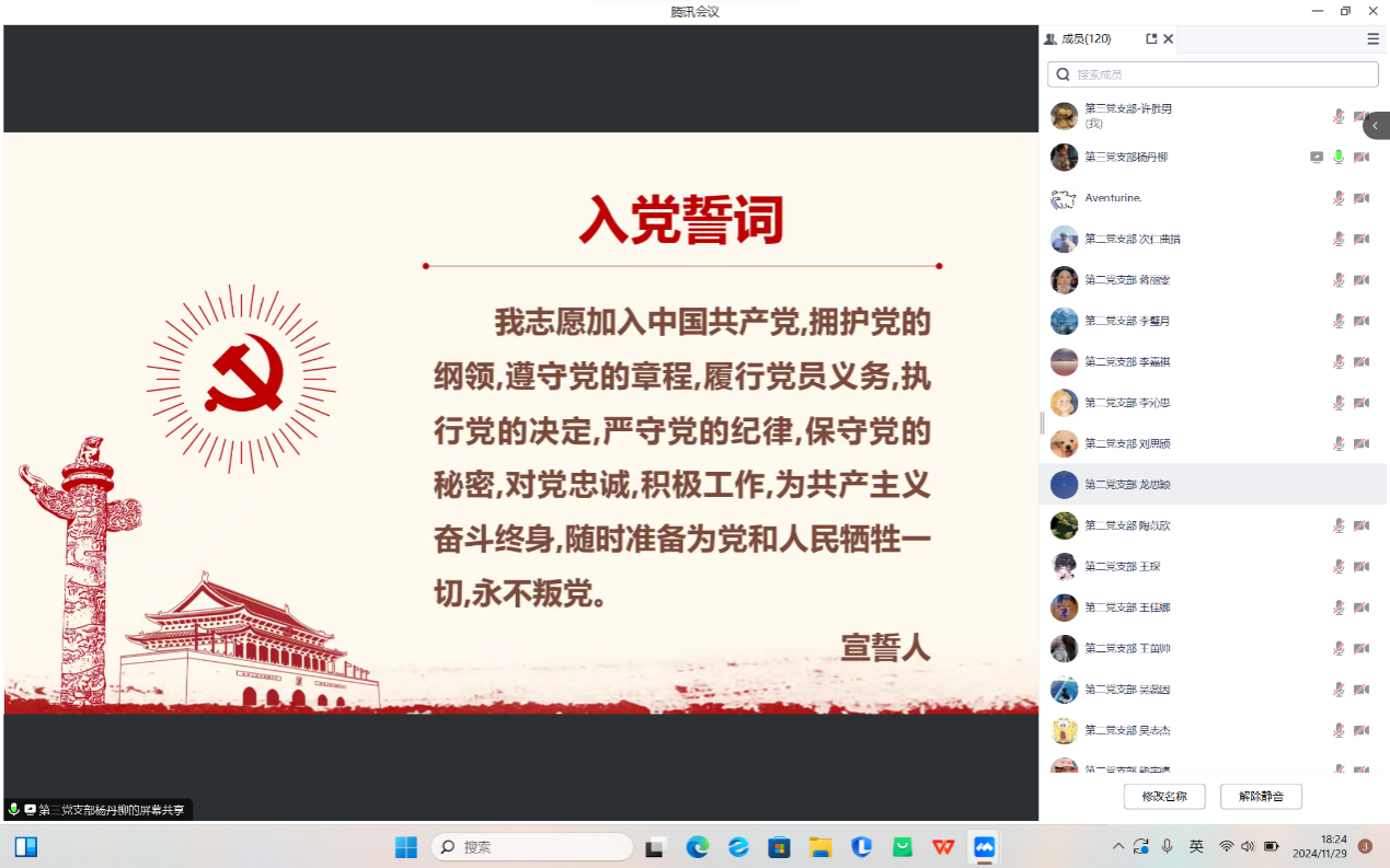 (通讯员:贺远宜 )为深入学习贯彻党的二十届三中全会精神,凝心聚力推动改革行稳致远,深入理解党中央促进高质量充分就业,为改善民生和经济发展提供重要支撑的伟大举措,笃行真理,理解共同推动构建人类命运共同体,促进世界和平,进一步助力广大青年练就过硬本领,展现青年群体的智慧和力量,奋力书写为中国式现代化挺膺担当的青春篇章,为构建人类命运共同体挺膺担当。工商管理学院本科2021级党支部于1129日晚在线上举办十一月党日活动,全体党员、预备党员、发展对象参加本次活动。