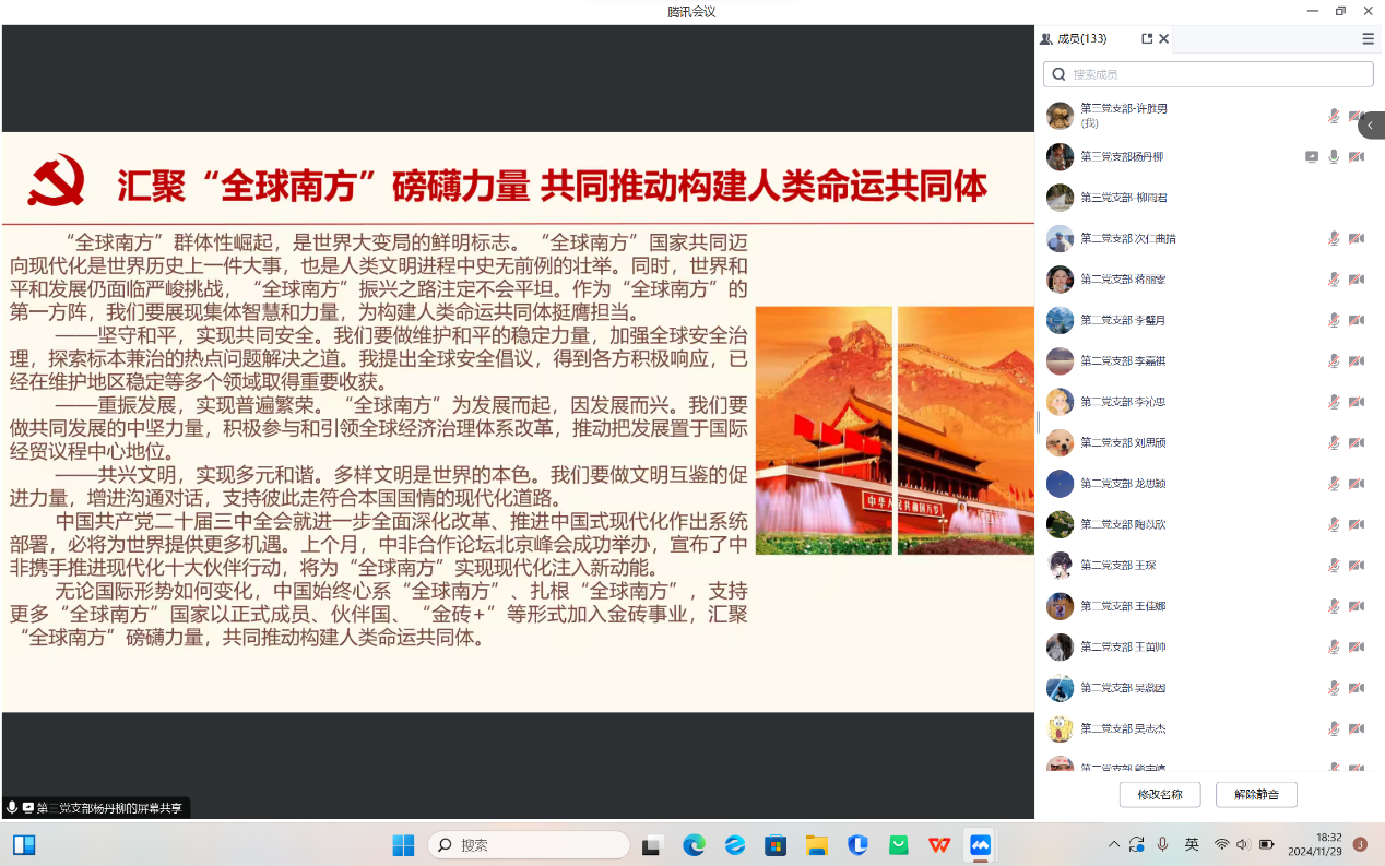 紧接着,在柳雨君同志的带领下,学习了《汇聚全球南方磅礴力量,共同推动构建人类命运共同体》,学习到了“全球南方”国家共同迈向现代化是世界历史上的一件大事,也是人类文明进程中史无前例的壮举,深刻领悟青年学子要贡献出集体智慧和力量,为构建人类命运共同体挺膺担当,把自己的理想同祖国的前途、把自己的人生同民族的命运紧密联系在一起,坚守和平,实现共同安全,重振发展,实现普遍繁荣,共兴文明,实现多元和谐,不断谱写无愧于前辈、无愧于时代、无愧于人民的壮丽篇章。