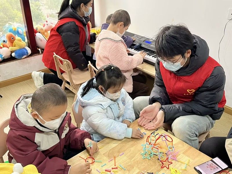 舞动身姿,跃动生命。在爱心小家的一边,一些孩子们正在模仿着视频跳舞。孩子们的脸上露出一丝羞涩,脚步也带着些犹豫与迟疑。志愿者轻轻带动,以轻柔的摇摆给予引导,孩子渐渐跟上节奏,小小的身躯开始有了律动。他们的舞姿或许并不标准,动作也略显笨拙,可那努力抬起的手臂,尽力踮起的脚尖,无不诉说着对生命的热爱与对快乐的渴望。一提到跳舞,一个小女孩顿时双眼放光,她沉浸在舞蹈的世界里尽情舞动,即使额头上沁出细密的汗珠,微微喘息着,却没有丝毫停下的意思。志愿者始终陪伴在孩子们左右,或挥臂,或移步,用行动传递着力量与支持,让这小小的空间成为充满爱与希望的舞台。