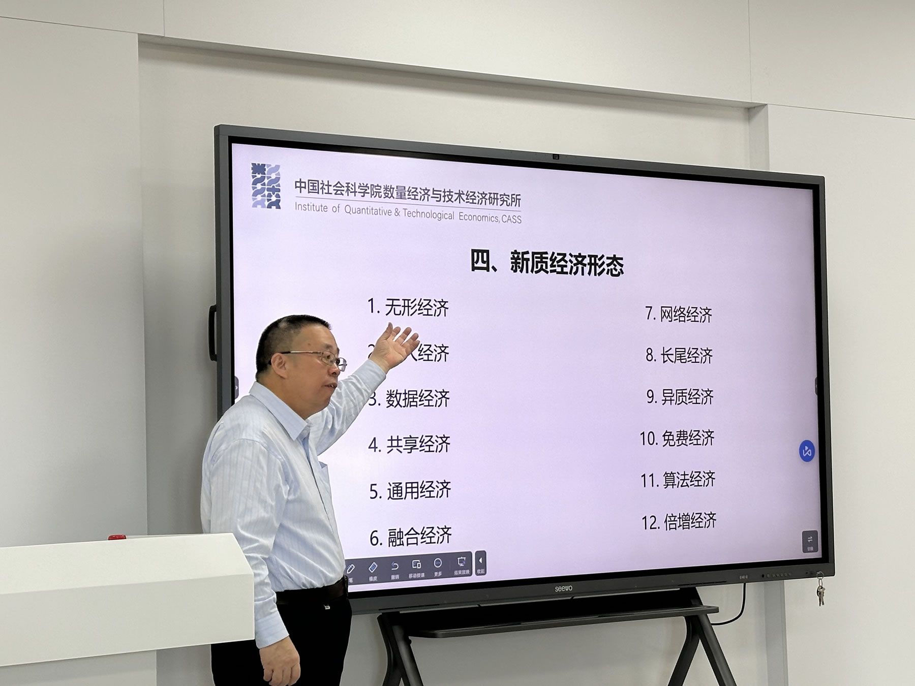 在讲座的第一部分,李教授详细阐述了新质生产力的三维抽象界定,包括质变、质优和质效,分别对应“三质”、“三高”和“三新”。他指出,新质生产力的特点在于高创新,关键在于高质量,而其标志则是高全要素生产率。随后,李教授还讨论了新质生产力的三维具象界定——质态,并按照”点、线、面”的逻辑具象化了新质生产力在要素、产业和经济三个层面的表现,他深刻指出新质生产力抽象与具象外在一体、内在关联。第二部分,李教授深入浅出介绍了新质要素形态,包括数智技术、数据资源、数智劳动、数字空间等八个方面,这些都是构成新质生产力的基础要素。第三部分则聚焦于新质产业形态,李教授列举了新质能源产业、新质设施产业、新质生成产业和新质业态产业,这些产业形态代表了新质生产力在不同领域的具体体现。在讲座的最后部分,李教授探讨了新质经济形态,包括无形经济、无人经济、数据经济等十二种经济形态,