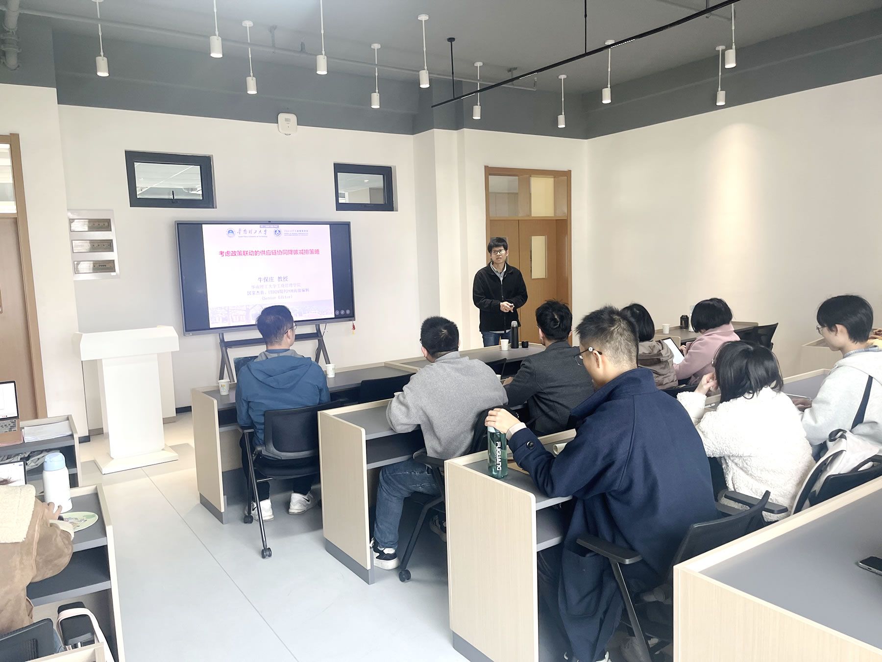 首场讲座由华南理工大学的牛保庄教授主讲,主题为“考虑政策联动的供应链协同降碳减排策略”。牛教授深入探讨了在绿色贸易壁垒、碳税、碳补贴等政策背景下,供应链企业如何通过协同作用提升减排效果。他通过构建博弈模型,分析了供应链中不同环节的决策对整体减排策略的影响,为企业提供了一系列实用的减排策略。