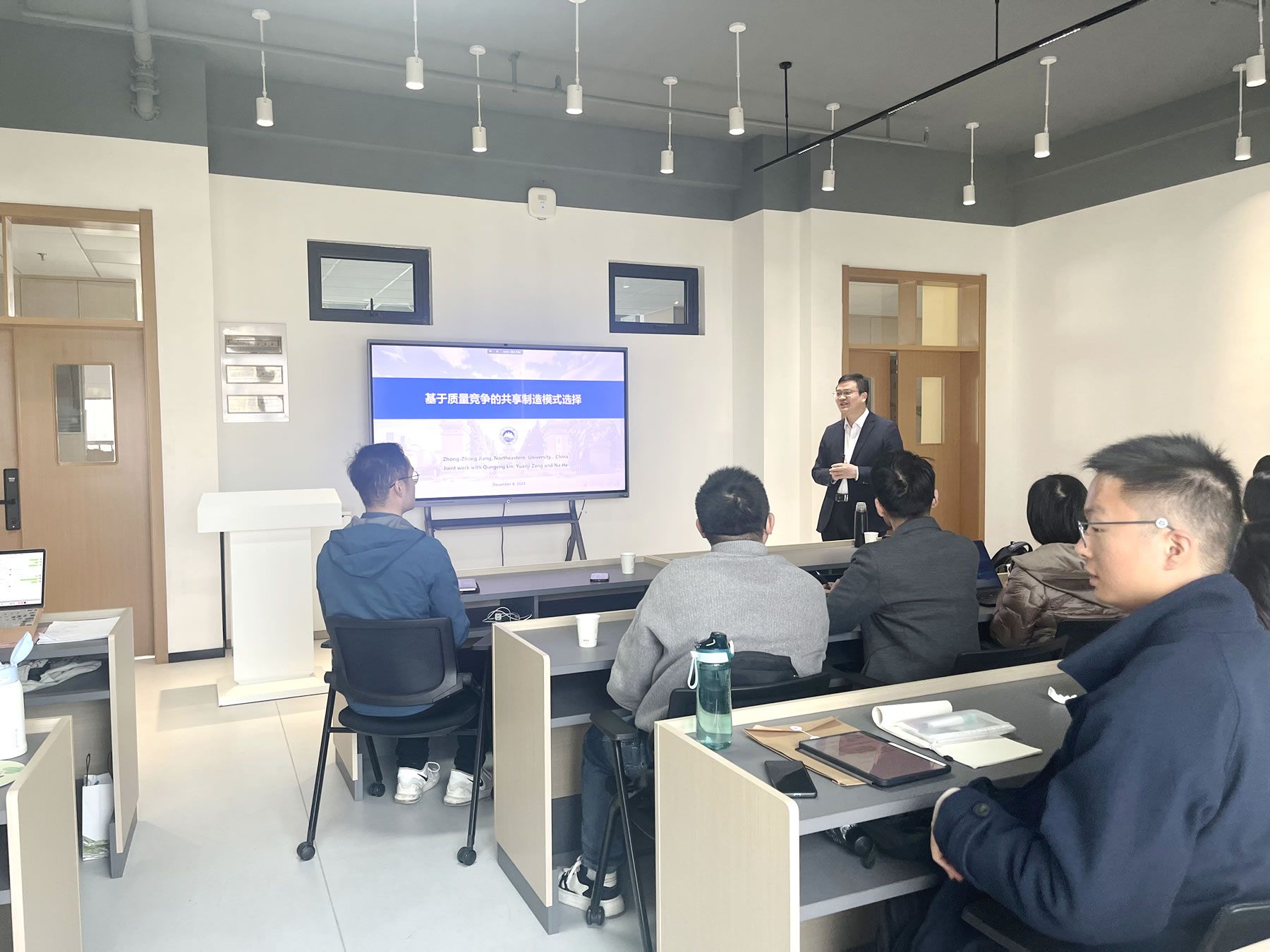 第二场讲座由东北大学工商管理学院的蒋忠中教授主讲,主题为“基于质量竞争的共享制造模式选择”。蒋教授分析了在不同消费领域中,共享制造如何与质量和需求竞争相结合,以实现双方合作共赢。他详细讨论了三种模式下的竞争博弈模型,