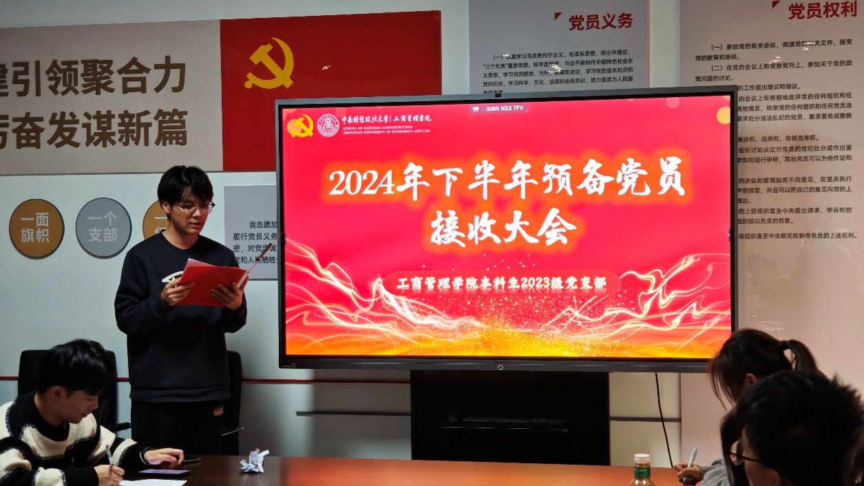 (通讯员 董云天)12月9日,工商管理学院本科生2023级党支部于文瀚楼北703会议室隆重召开2024年下半年预备党员接收大会。此次大会严格遵循党员发展程序,会议由杜国瑜同学主持,工商管理学院本科生2023级党支部书记何强老师、2023级辅导员徐若冰老师、2023级辅导员郭小义老师以及党员代表、入党积极分子代表共同出席会议,支部应到党员3名,实到3名,会议有效。