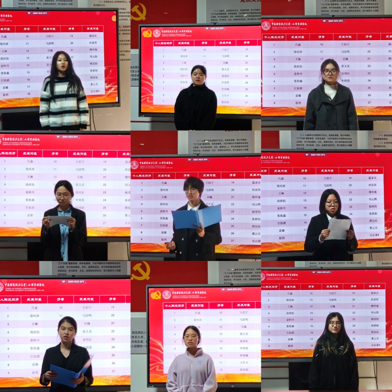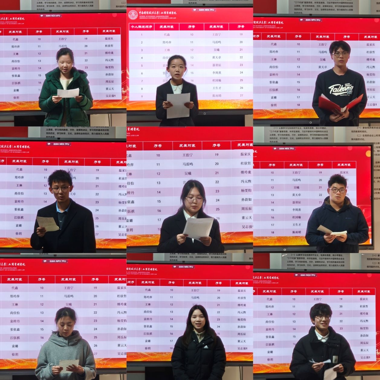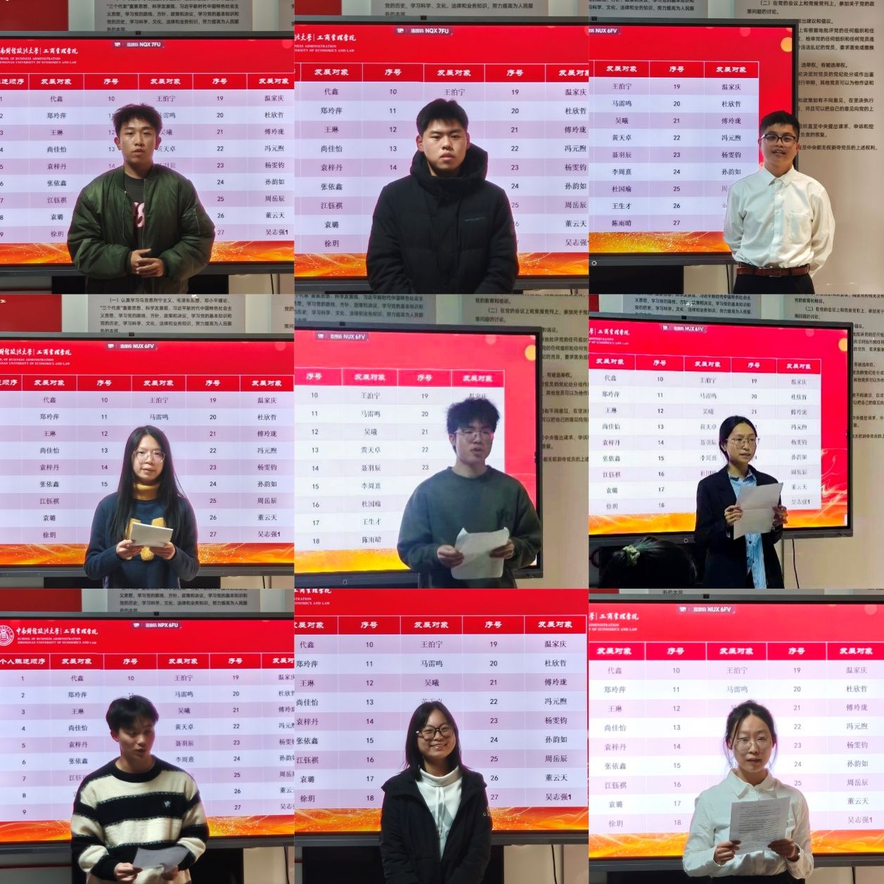在发展对象汇报环节,27名发展对象按序登台,他们以严肃认真的态度,分别从对党的深刻认知、入党的真挚动机、个人学习与社会实践经历、家庭主要成员政治情况以及需向党组织说明的问题等方面进行了详实汇报,展现了自身积极向党组织靠拢的坚定决心与切实行动。汇报结束后,随即进行理论知识抽答,检验各发展对象对党的理论知识的掌握程度。每位发展对象汇报完毕,入党介绍人都细致地介绍其优点与不足,使党组织对发展对象有了更为全面、客观的了解。