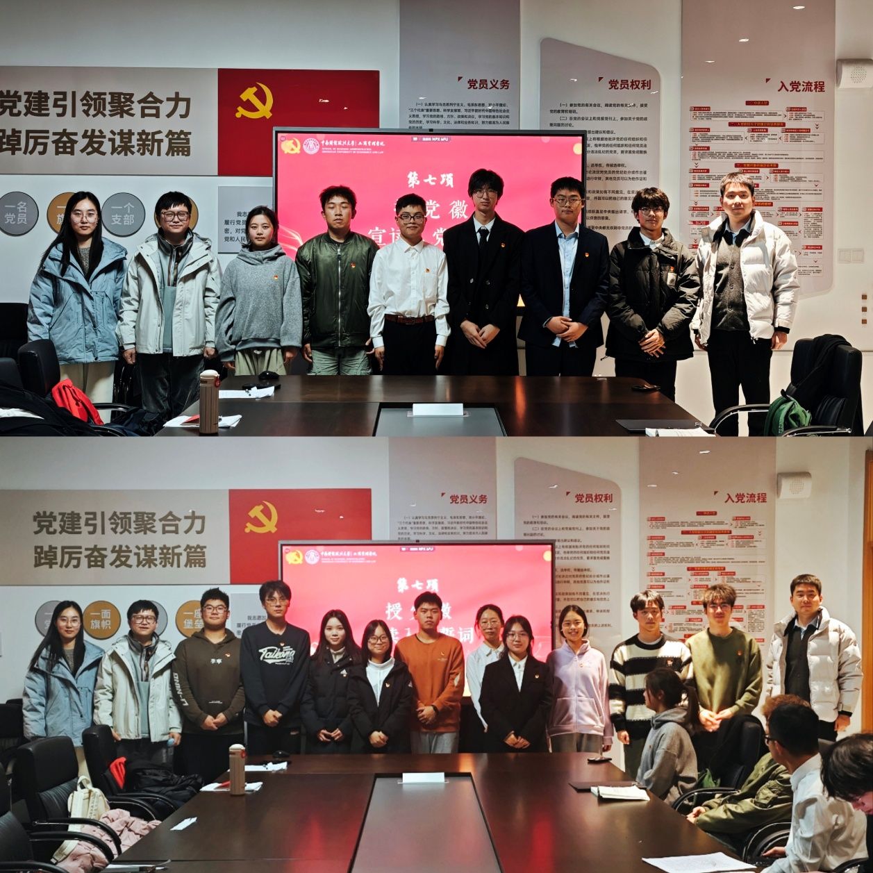 进入授党徽与宣读入党誓词环节,三位辅导员老师满怀庄重地为预备党员们逐一佩戴党员徽章,党徽在灯光下熠熠生辉,象征着党的使命与担当。