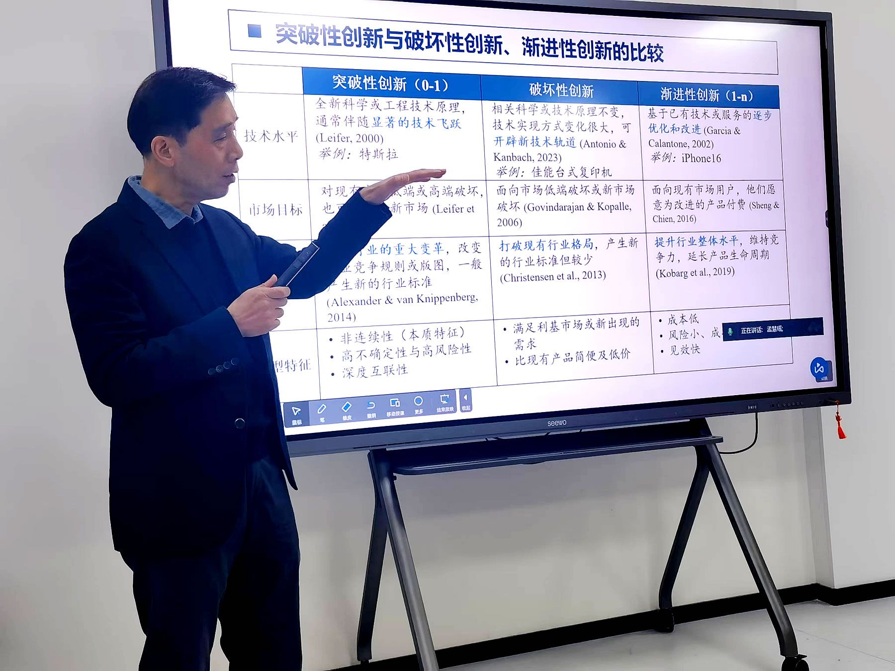 第一场讲座中,刘智强教授分享了其研究团队所进行的人-AI协同进化与突破性创新研究。首先,刘教授通过全球市值最高的十家企业引入突破性创新这一主题,接着刘教授介绍了突破性创新的内涵与范围界定,突破性创新(Radical Innovation)是指“产生并实施显著性偏离现有产品、流程、服务、商业模式或管理方式,且需要全新知识和能力并对组织有用的创意、产品或服务”,并比较了突破性创新与破坏性创新、渐进性创新的区别与联系。其次,刘教授分析了突破性创新的本质特征:非连续性、高不确定性与高风险性、深度互联性,并提出人-AI交互的解决思路,人类与AI之间并不是简单的创造与被创造、主宰与被主宰的关系,而是更像两种不断进化、相互影响和塑造的生命间的共生关系,并得出两个命题:人-AI协同进化能够通过缓解信任难题,间接推动竞合交融,进而实现突破性创新;人-AI协同进化能够通过跨越信任难题,直接推动竞合交融,进而实现突破性创新。