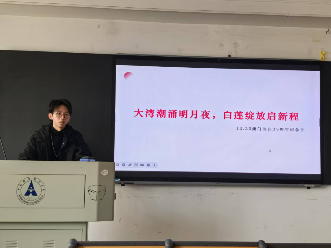 【通讯员:许玉彬】霜华敛暖,素冬藏韵。12月19日,工商2401班全体学生齐聚文津304教室,庄重举行以“共筑未来:青春与合作的力量”为主题的12月团日活动。此次活动由314与315寝室同学共同策划设计,穆会玲同学担任主持人。活动分为“一带一路画愿景,命运共同展宏图”“青春当有为,共饮长江水”“勇当志愿先锋,彰显青春担当”“大湾潮涌明月夜,白莲绽放启新程”四个主题,旨在拓展同学们的国际视野和经济知识领域,学习贯彻习近平总书记关于外交方面的思想,鼓励同学们践行志愿服务精神和社会主义核心价值观,为推动澳门长期繁荣稳定和国家统一贡献青春力量。