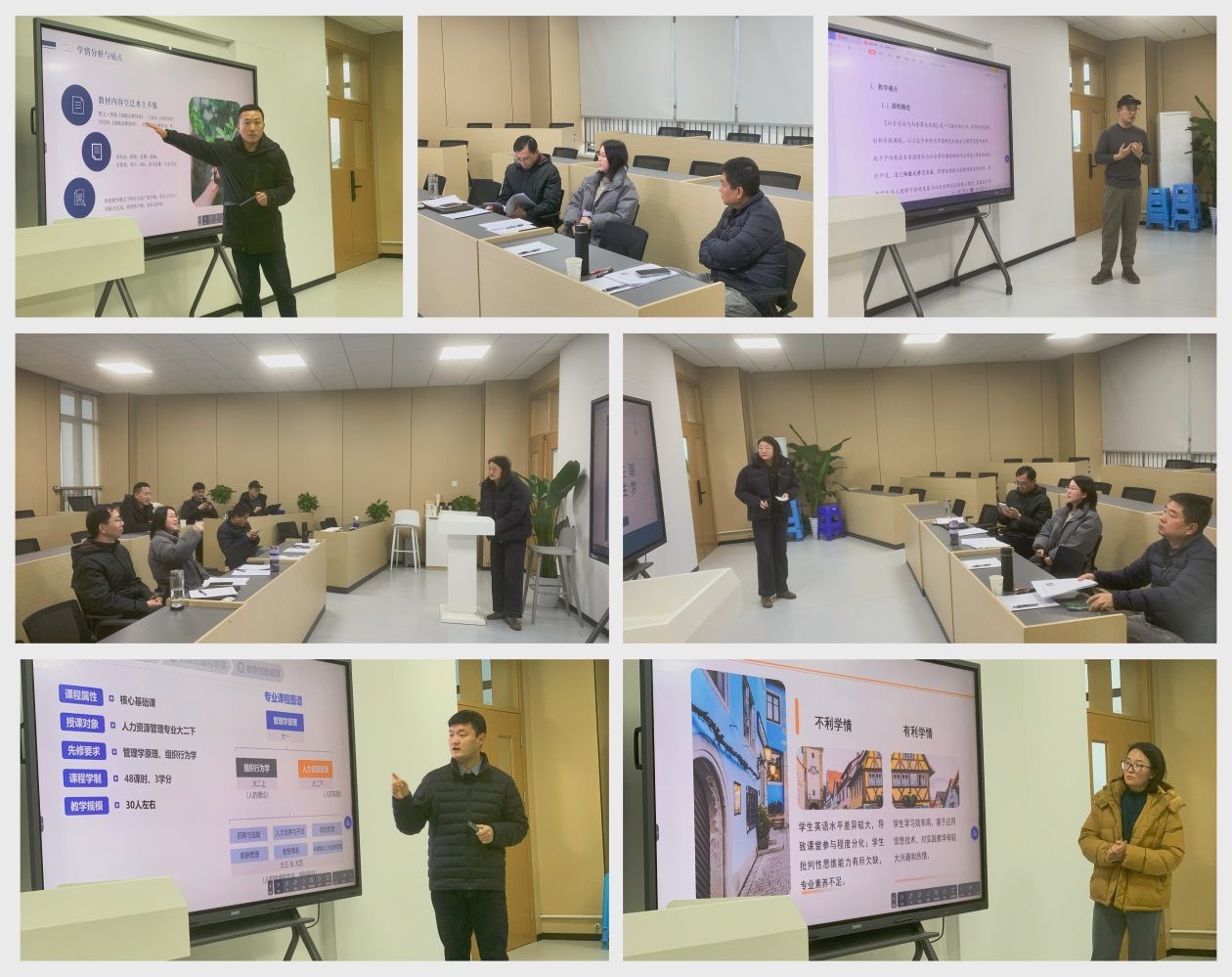几位老师经过前期认真准备,依次上台分享。老师们从教材内容、教学方法、教学形式改革创新、教学中遇到的痛点、难点及举措等方面一一进行了展示。三位指导老师认真聆听,及时发现授课亮点和有待突破点逐一进行了全面且细致的专业辅导,有针对性地提出各种改进意见,对每位老师的课程都进行了深度打磨。