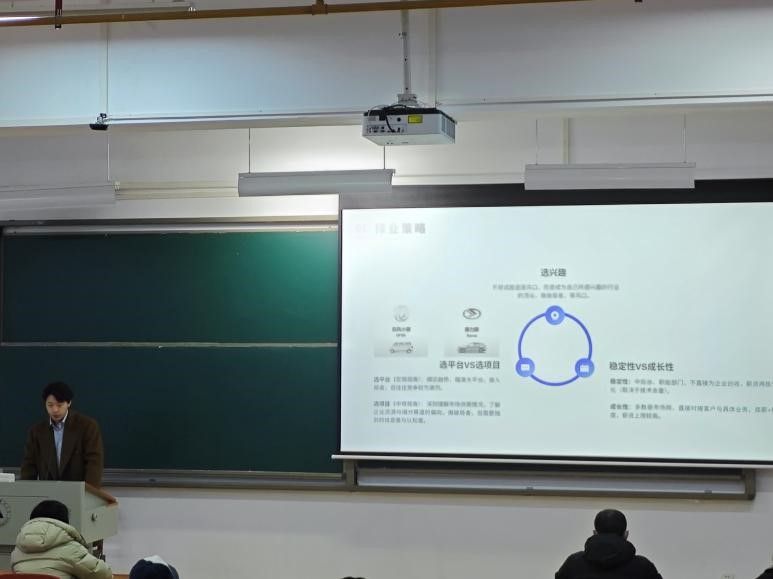 在就业方向的阐述中,何君尧细致介绍了制造业、消费零售、服务业等主要行业类别,通过清晰的分析让同学们对各行业特点有了更直观的认识。择业策略上,他着重强调追寻兴趣的重要意义,鼓励同学们立志成为所在行业的佼佼者,而非盲目跟风追逐热点。同时,他以独到视角对比稳定性与成长性岗位,深入剖析选平台与选项目的优劣,为同学们提供了多元且全面的思考方向。