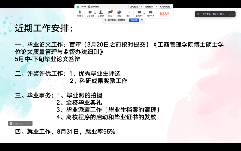 在本次班会的开场环节,赵老师详细介绍了本学期的工作安排。她指出,毕业相关事务是本学期的重点,内容包括毕业论文的盲审、5月中下旬的论文答辩、优秀毕业生评选、科研成果奖励、毕业照拍摄以及全校毕业典礼等重要环节。赵老师提醒同学们要提前做好准备,确保各项工作顺利推进。同时,赵老师着重强调了当前就业工作的严峻形势。她指出,尽管就业市场竞争激烈,但同学们仍需保持积极态度,抓住春季招聘的宝贵机会,大家须保持信心,继续努力,为研究生生活画上圆满的句号。