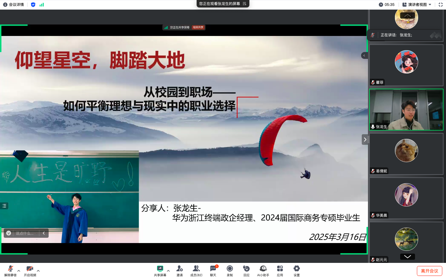 随后,分享嘉宾张龙生以“仰望星空,脚踏实地——从校园到职场,如何平衡理想与现实中的职业选择”为主题展开,从多个方面为同学们介绍了从学生到职场人的身份转换的心路历程。