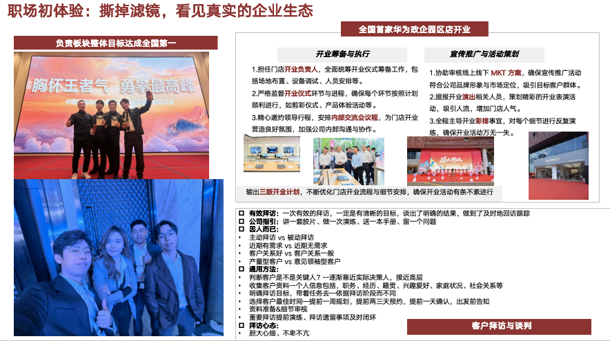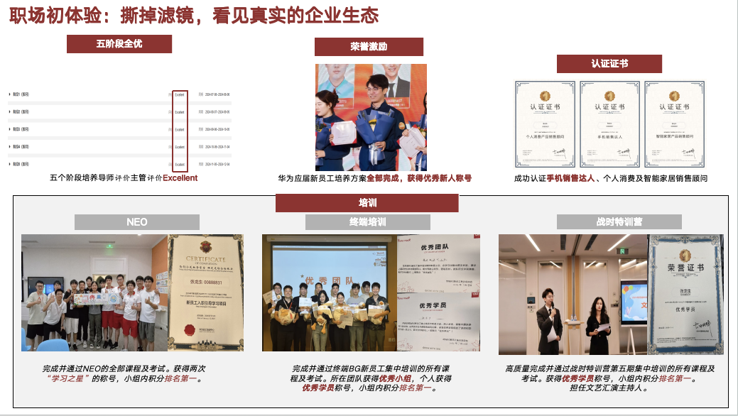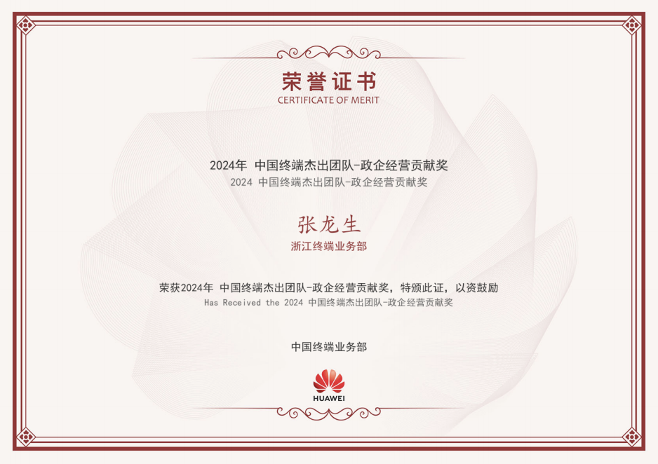 入职华为后,他迅速崭露头角:在新人培养体系中,五阶段考核皆获“Excellent”,还荣膺优秀新人称号,并成功拿下手机销售达人等多项专业认证,为业务开展筑牢根基;培训学习中,无论是NEO课程,还是终端培训与战时特训营,他都成绩斐然,多次荣获“学习之星”和优秀学员,小组积分始终名列前茅;在业务执行上,他作为全国首家华为政企园区店开业负责人,精心筹备执行,精准宣传推广,助力门店顺利开业,且负责板块目标达成全国第一,凭借卓越的业务能力,他成功拓展众多重要客户,带领团队攻克多项关键业务,大幅提升区域市场份额,荣获2024年中国终端杰出团队-政企经营贡献奖;在工作之余,他积极参与内部培训与项目交流,曾担当文艺汇演和大会主持人,分享跨文化沟通服务案例;在接待国外顾客的工作中,输出标准服务SOP,展现出全面的综合素质和积极的企业融入度。