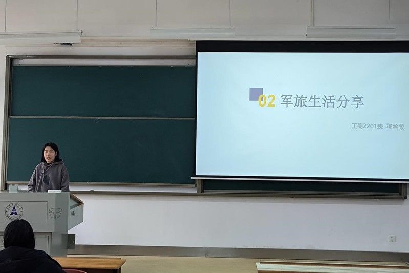 紧接着,工商2201班退伍义务兵杨丝柔同学以亲身军旅经历为引,向同学们解读入伍政策、介绍服役程序,并分享了自己服役生活的点滴。她向大家展示了部队中的严格培训、坚守岗位的职责与日常值班经历,强调在挑战中自我成长,享受“集体中的快乐”。同时,杨丝柔呼吁同学们在日常生活中应厚植家国情怀,积极践行爱国主义精神,将个人的成长与国家命运紧密相连,时刻保持对国家的忠诚与热爱,努力成为有担当、有情怀的新时代青年。