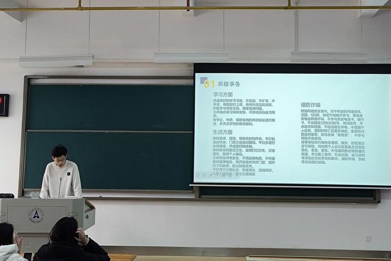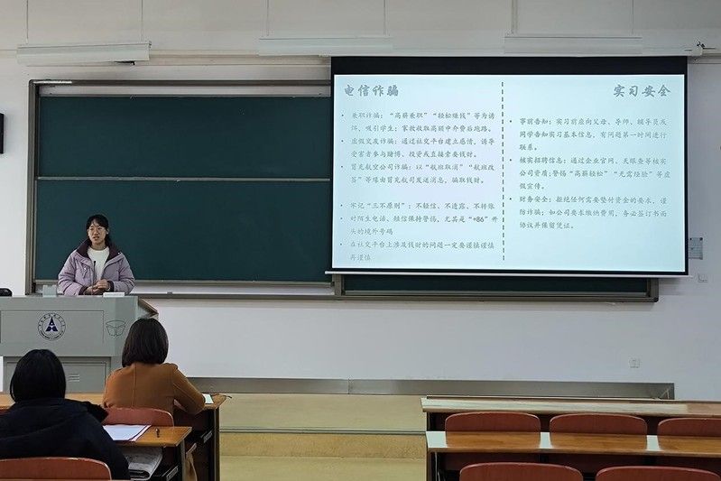 理论学习结束后,工商2202班班长王艺燃再次强调了安全问题。她围绕电信诈骗、实习安全、宿舍安全等多个方面,详细阐述了潜在的风险与防范措施。王艺燃同学要求大家不断提高安全意识,时刻保持警惕,保护好自己的人身安全和财产安全,要将安全意识融入日常学习和生活中,确保班级整体的安全稳定,为新学期的学习和生活保驾护航。