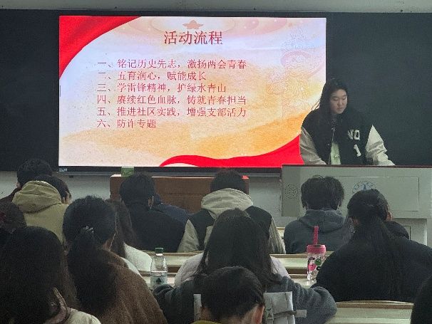 “推进社区实践,激发支部活力” 陈恩之同学向全体团员发出倡议,号召大家积极参与社区志愿服务、社会调研等实践活动,将理论转化为行动力。会上还分享了往期社区实践案例,鼓励同学们在实践中增长才干、锤炼品格。同学们纷纷表示将会更加积极投入社会实践,让青春在实践中出彩。