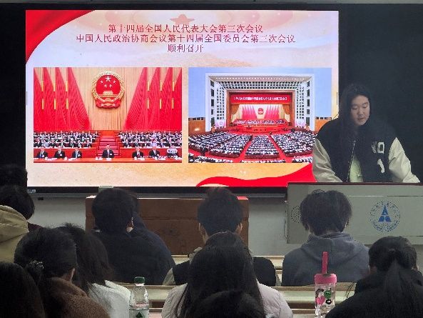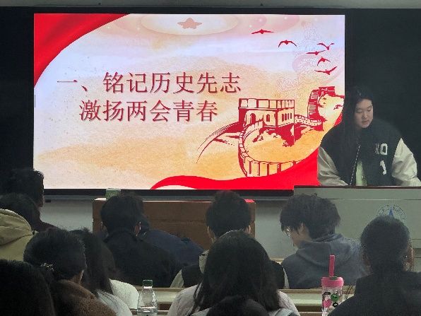 “学两会精神,悟马克思主义真理”团支书陈恩之同学结合全国两会最新精神,带领同学们学习《共产党宣言》的核心思想,深入阐释马克思主义中国化的时代意义。同时通过"理论串讲+金句解读"形式,系统梳理两会热点,剖析马克思主义基本原理的当代实践。随后,团员代表分享读书心得,从理论与实践角度探讨马克思主义对当代青年的指导作用,引发了热烈讨论。